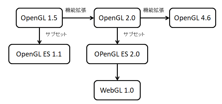 https://www.opengl.org/OpenGL ES (OpenGL for Embedded Systems) は、組込み機器の上で 2D/3D CG 描画を行うために 2003, 2004年ごろにOpenGLから派生した仕様です。 OpenGL ES 2.0 は、OpenGL 2.0 をベースとして新しい機能を追加し、冗長な機能や古い機能を削除したもので、 非常にシンプルですが、3D CG を実現するのに十分なライブラリです。 スマートフォンやゲーム機などで利用されています。