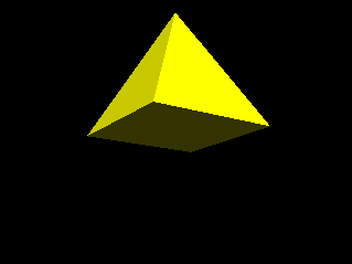 P0:( 0, 2, 0) P1:( 1, 0, 1) P2:( 1, 0,-1) P3:(-1, 0,-1) P4:(-1, 0, 1)であり、どの面の色も(1.0, 1.0, 0.0)であるとする。 また、視点:(6.0, -2.0, 4.0), 注視点:(0.0, 0.0, 0.0), 上方向:(0.0, 1.0, 0.0)であり、 平行光の色は(1,1,1)で方向は(1.0, 0.5, 0.5), 環境光の色は(0.2, 0.2, 0.2)とする。