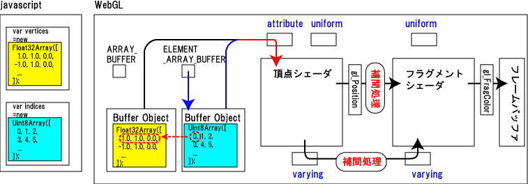 その場合は、頂点の座標を頂点シェーダの attribute 変数を 経由して gl_Position に設定した上で、 図形を表すインデックスの配列をバッファオブジェクトとして WebGLのELEMENT_ARRAY_BUFFERをターゲットとして送り込んでおき、 gl.drawElements()を使って描画します。