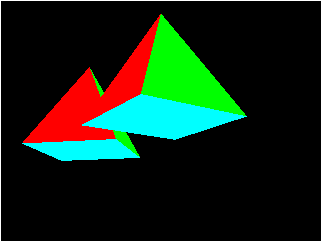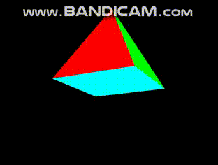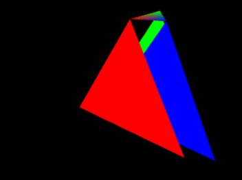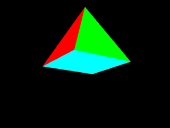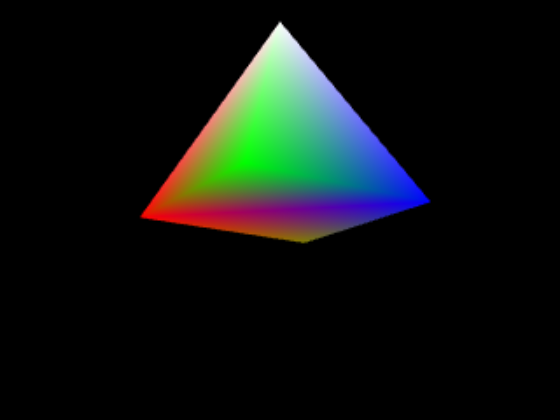 頂点の座標 色 P0:( 0, 2, 0) (1,1,1) P1:( 1, 0, 1) (1,0,0) P2:( 1, 0,-1) (0,1,0) P3:(-1, 0,-1) (0,0,1) P4:(-1, 0, 1) (0.5,0.5,0) 視点:(6.0, -2.0, 4.0), 注視点:(0.0, 0.0, 0.0), 上方向:(0.0, 1.0, 0.0)