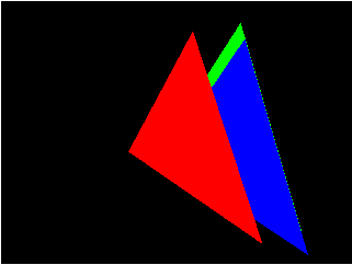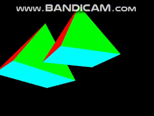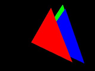 モデル行列として「y軸回りに45度回転してから、x軸方向に-3平行移動する」という行列を設定してから MvpMatrixを再計算し、uniform変数 u_MvpMatrix 経由で WebGL に送りこんで描画させてみます。 前の描画を消さずに次の図形を描画したので、合計で2個の図形が描画されています。 あとから描いた図形が、先に描いた図形の後ろに正しく描画されていることに注意して下さい。