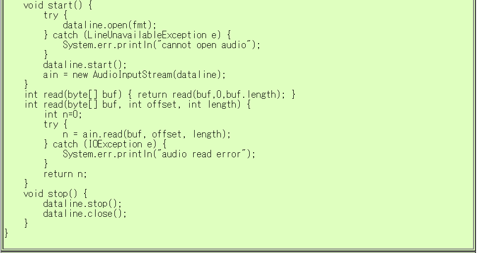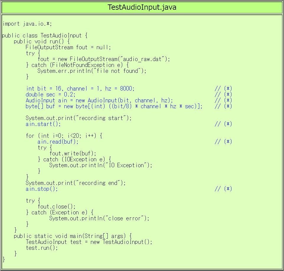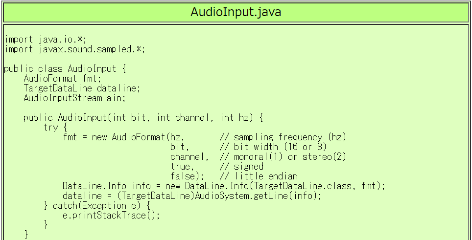 Javaで音声入力を扱うための AudioInput クラスを作成しました。 AudioInputクラスの利用方法は TestAudioInput.java の // (*)がコメントについた行 を参照して下さい。