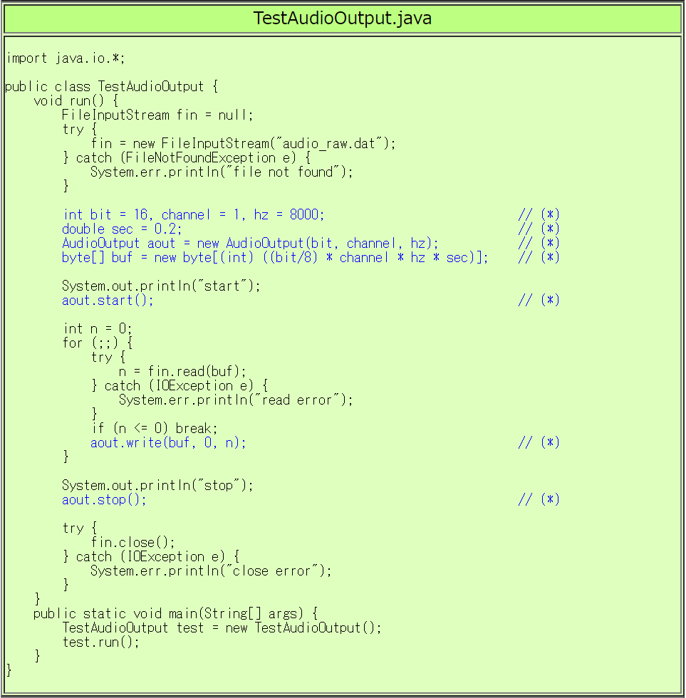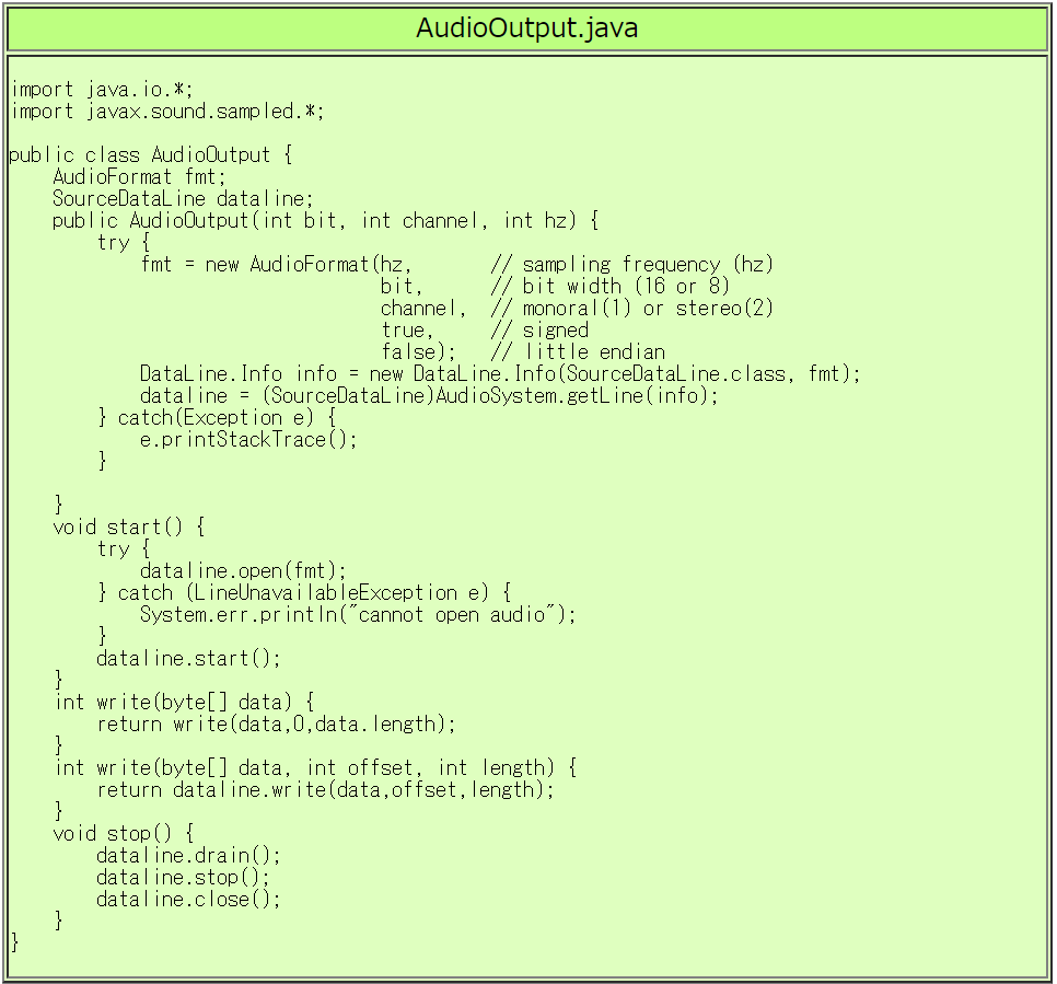 Java で音声再生を扱うための AudioOutputクラスを作成しました。 AudioOutputクラスの利用方法は TestAudioOutput.java の // (*)がコメントについた行 を参照して下さい。