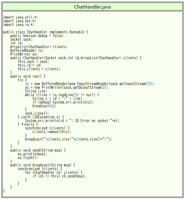 複数のクライアントを管理するために ArrayListクラスを使います。 このクラスはthread safeではないので、ArrayListのインスタンスに 変更を加える(要素を加える、要素を削除する、など)場合は synchronizedを使って同期する必要があります。