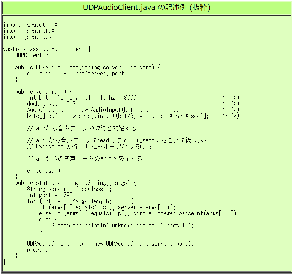 [ヒント] UDPClient.java と AudioInput.java を利用します。 UDPSendClient.java と TestAudioInput.java の青文字の部分が参考になるでしょう。