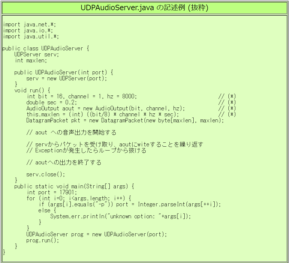 [ヒント] UDPServer.java と AudioOutput.java を利用します。 UDPRecvServer.java と TestAudioOutput.java の青文字の部分が参考になるでしょう。