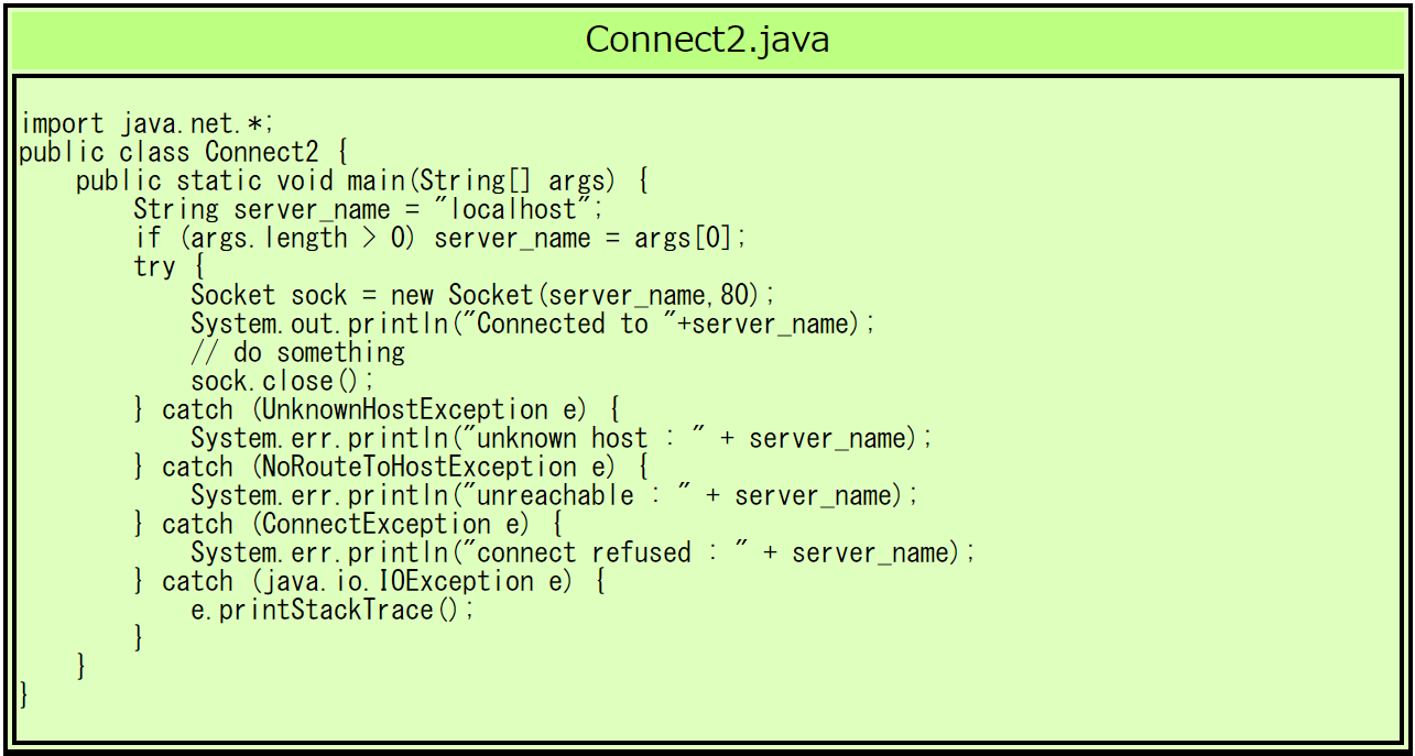 $ java Connect2 nw.tsuda.ac.jp ← WWWサーバが動いているホスト