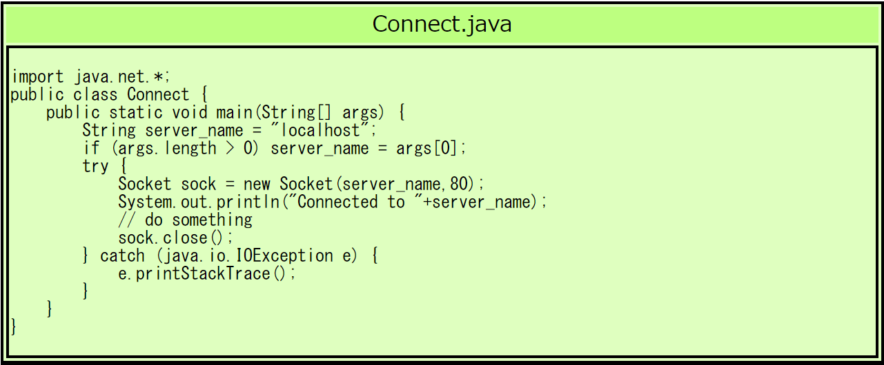 $ java Connect nw.tsuda.ac.jp ← WWWサーバが動いているホスト