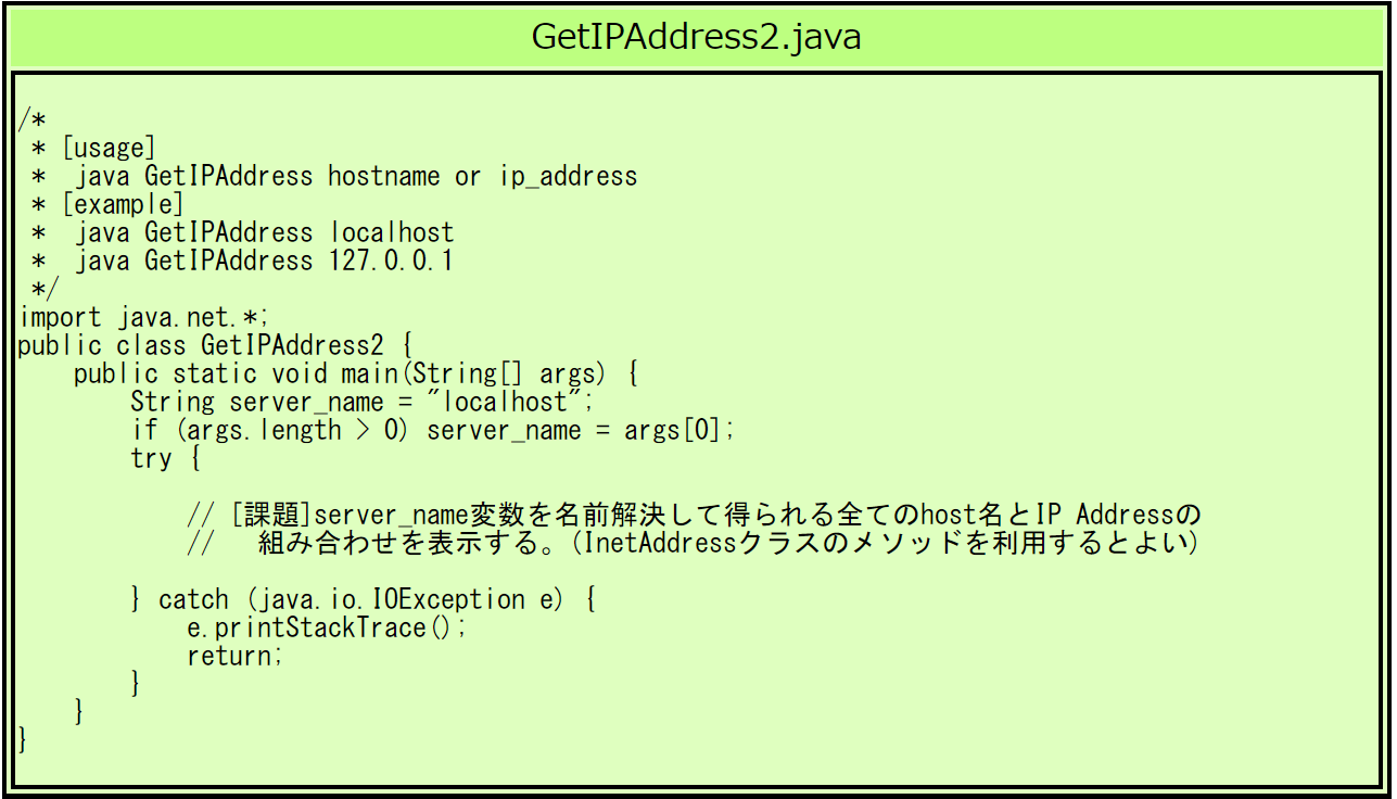 $ java GetIPAddress nw.tsuda.ac.jp ← ホスト名を指定する