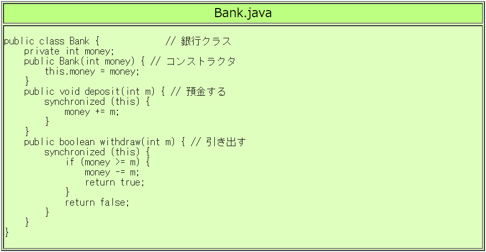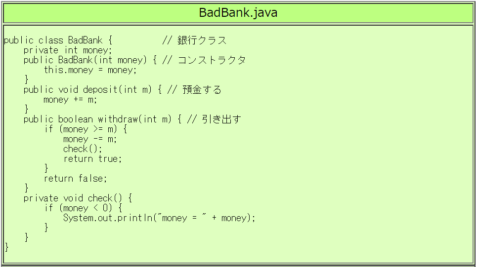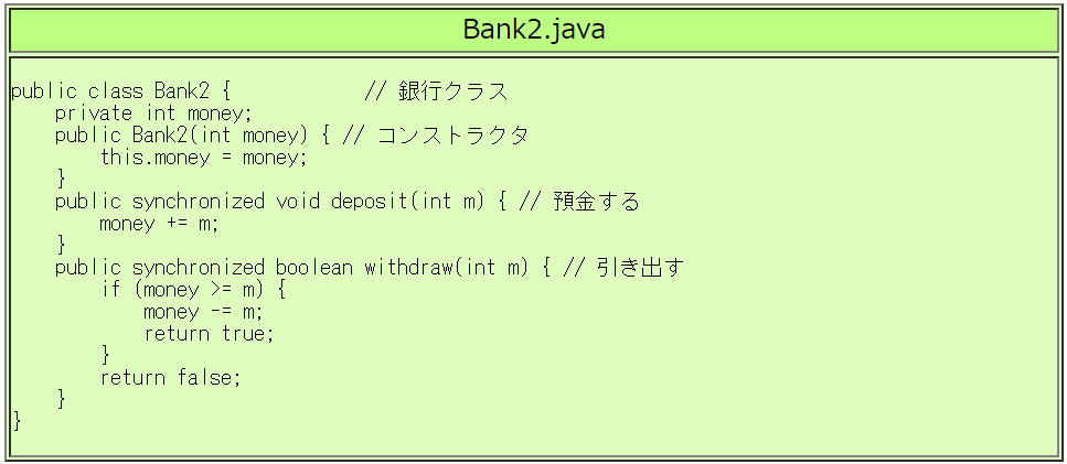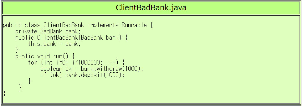 BadBankクラスの代わりに、つぎのようなBankクラスやBank2クラスを 使うと正しく動作します。