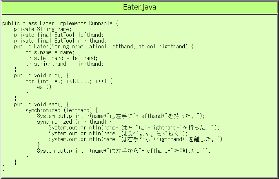 | 提出ファイル | 書き換えてデッドロックが起きなくなったEater.java |