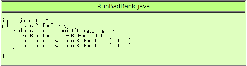 | RunBadBank.javaの実行例 |