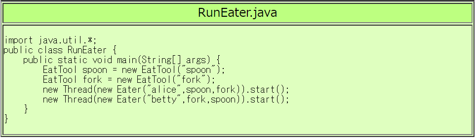 RunEater.java や Eater.java を書き換えて、デッドロックが起きないようにして下さい。 (ヒント: アリスとベティが共通のオブジェクトでsynchronizeすればよい。 それにはRunEater.javaのmainで