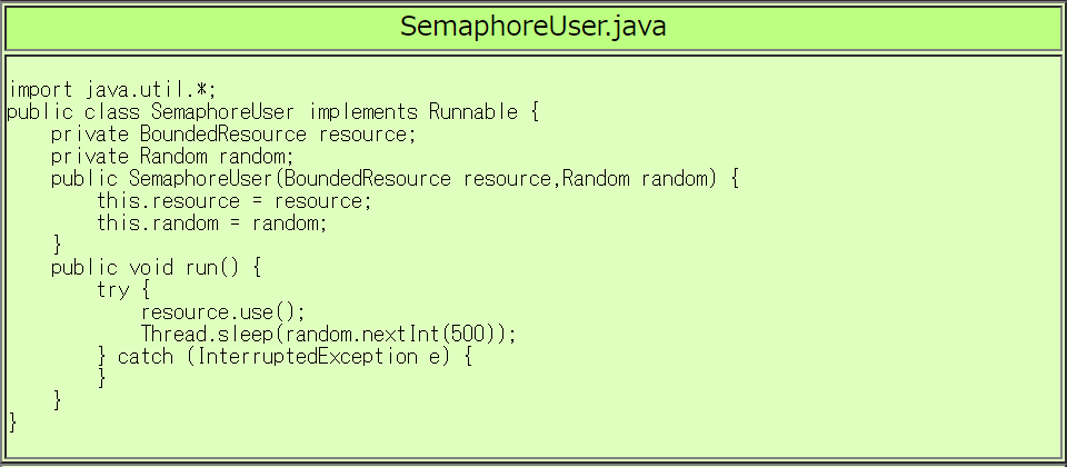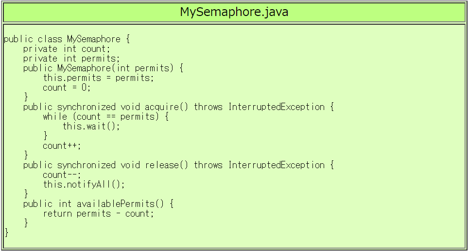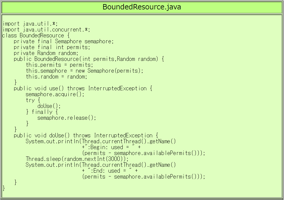 セマフォは自分でも簡単に作ることができます。 BoundedResourceクラスを、自分で作ったセマフォMySemaphore.java を使うように変更してみましょう。