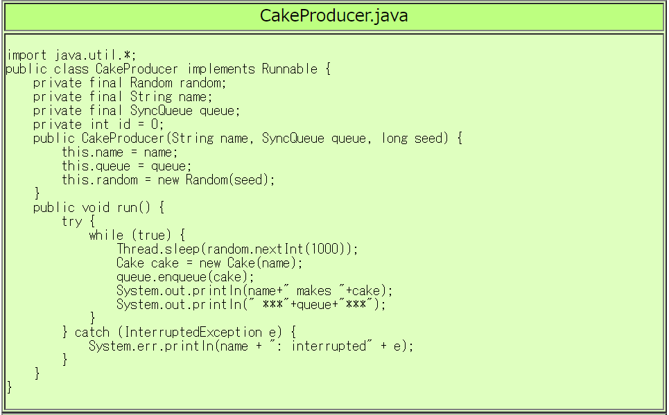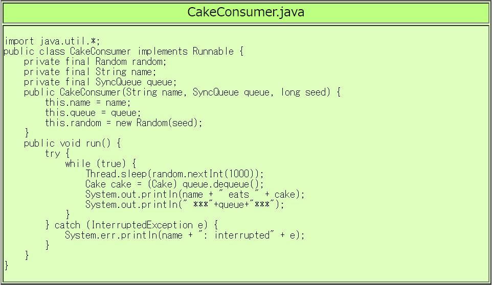 $ javac CakeMain.java CakeProducer.java CakeConsumer.java SyncQueue.java Cake.java $ java CakeMain Producer1 makes Cake0@Producer1 ***[Cake0@Producer1 ]*** Producer1 makes Cake1@Producer1 ***[Cake0@Producer1 Cake1@Producer1 ]*** Consumer1 eats Cake0@Producer1 ***[Cake1@Producer1 ]*** Consumer1 eats Cake1@Producer1 ***[]*** Producer2 makes Cake2@Producer2 ***[Cake2@Producer2 ]*** Producer0 makes Cake3@Producer0 ***[Cake2@Producer2 Cake3@Producer0 ]*** Consumer0 eats Cake2@Producer2 ***[Cake3@Producer0 ]*** Consumer2 eats Cake3@Producer0 ***[]*** Producer0 makes Cake4@Producer0 ***[Cake4@Producer0 ]*** Consumer2 eats Cake4@Producer0 ***[]*** Consumer1 eats Cake5@Producer1 ***[]*** Producer1 makes Cake5@Producer1 ***[]*** Producer1 makes Cake6@Producer1 ***[Cake6@Producer1 ]*** Producer2 makes Cake7@Producer2 ***[Cake6@Producer1 Cake7@Producer2 ]*** Consumer0 eats Cake6@Producer1 ***[Cake7@Producer2 ]*** Producer0 makes Cake8@Producer0 ***[Cake7@Producer2 Cake8@Producer0 ]*** Producer0 makes Cake9@Producer0 ***[Cake7@Producer2 Cake8@Producer0 Cake9@Producer0 ]*** Consumer2 eats Cake7@Producer2 ***[Cake8@Producer0 Cake9@Producer0 ]*** Producer2 makes Cake10@Producer2 ***[Cake8@Producer0 Cake9@Producer0 Cake10@Producer2 ]*** Consumer1 eats Cake8@Producer0 ***[Cake9@Producer0 Cake10@Producer2 ]*** Producer2 makes Cake11@Producer2 ***[Cake9@Producer0 Cake10@Producer2 Cake11@Producer2 ]*** Consumer0 eats Cake9@Producer0 ***[Cake10@Producer2 Cake11@Producer2 ]*** Producer1 makes Cake13@Producer1 ←Cake13がキューに(Cake12はwait中) ***[Cake10@Producer2 Cake11@Producer2 Cake13@Producer1 ]*** Consumer2 eats Cake10@Producer2 ***[Cake11@Producer2 Cake13@Producer1 ]*** Producer1 makes Cake15@Producer1 ←Cake13がキューに(Cake14はwait中) ***[Cake11@Producer2 Cake13@Producer1 Cake15@Producer1 ]*** Consumer1 eats Cake11@Producer2 ***[Cake13@Producer1 Cake15@Producer1 ]*** Producer2 makes Cake12@Producer2 ←やっとCake12がキューに。 ***[Cake13@Producer1 Cake15@Producer1 Cake12@Producer2 ]*** Consumer0 eats Cake13@Producer1 ***[Cake15@Producer1 Cake12@Producer2 ]*** Producer1 makes Cake16@Producer1 ←Cake16がキューに。 ***[Cake15@Producer1 Cake12@Producer2 Cake16@Producer1 ]*** Consumer2 eats Cake15@Producer1 ***[Cake12@Producer2 Cake16@Producer1 ]*** Producer0 makes Cake14@Producer0 ←やっとCake14がキューに。 ***[Cake12@Producer2 Cake16@Producer1 Cake14@Producer0 ]*** Consumer1 eats Cake12@Producer2 ***[Cake16@Producer1 Cake14@Producer0 ]*** Producer1 makes Cake17@Producer1 ***[Cake16@Producer1 Cake14@Producer0 Cake17@Producer1 ]*** Consumer0 eats Cake16@Producer1 ***[Cake14@Producer0 Cake17@Producer1 ]*** Producer1 makes Cake18@Producer1 ***[Cake14@Producer0 Cake17@Producer1 Cake18@Producer1 ]*** ... |