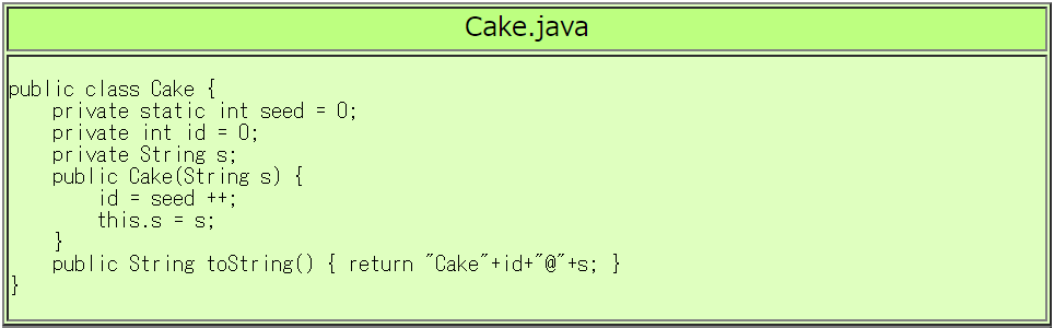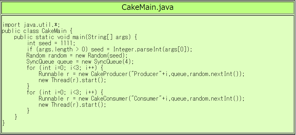 [注意] もしも何度実行しても、Cakeの順番が入れ替わらない場合は Producerの数を(5とかに)増やして、 SyncQueueの容量を(3に)減らすなどの変更をしてみて下さい。