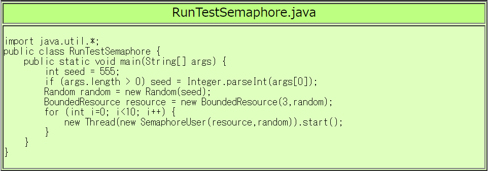 | MySemaphoreを使ったRunTestSemaphore.javaの実行例 |