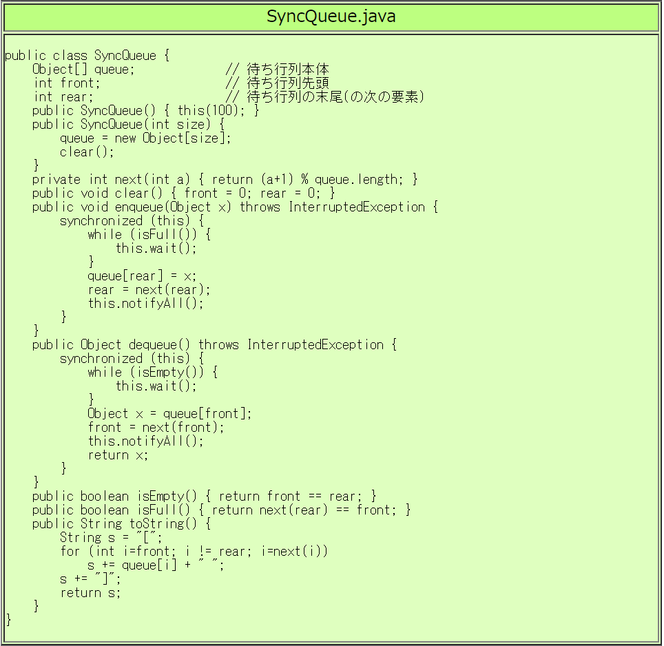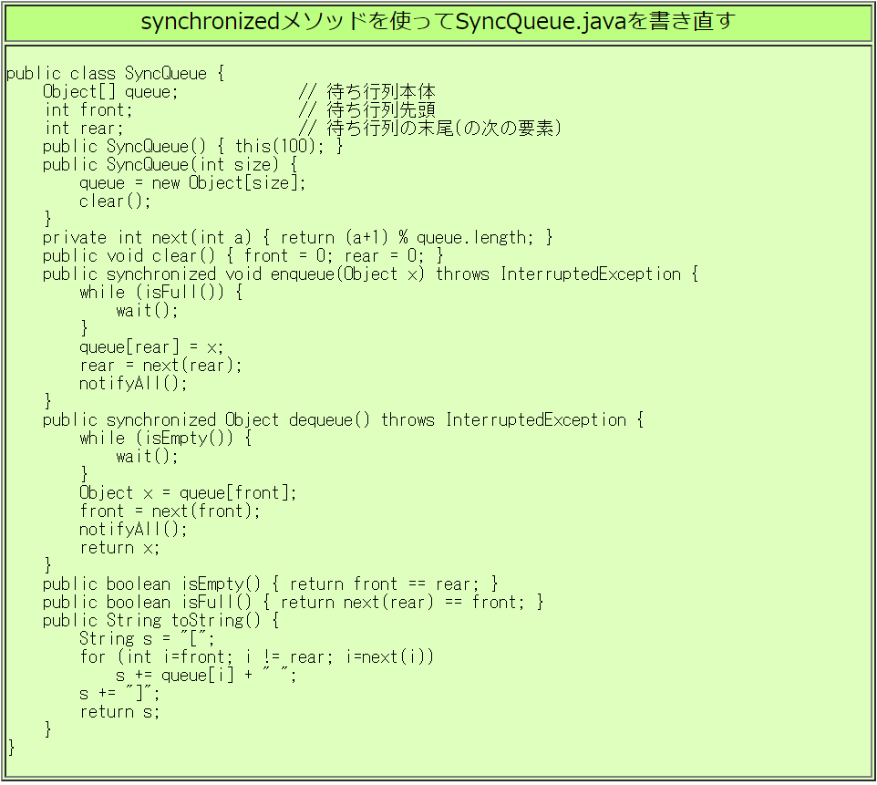SyncQueue.javaはsynchronized文で記述したが、thisでメソッド全体に ロックを掛けているので次のように記述しても構いません。 (ここではthisはプログラムの実行中に使われるSyncQueueオブジェクト を指します。)