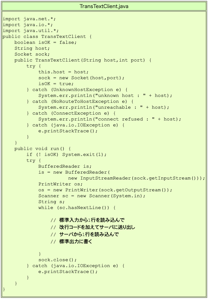 ユーザからの入力を1行毎に読んでサーバに送り、 その度にサーバが返すデータを1行読んで、 それをユーザに表示するクライアントを書いてみましょう。→演習問題
