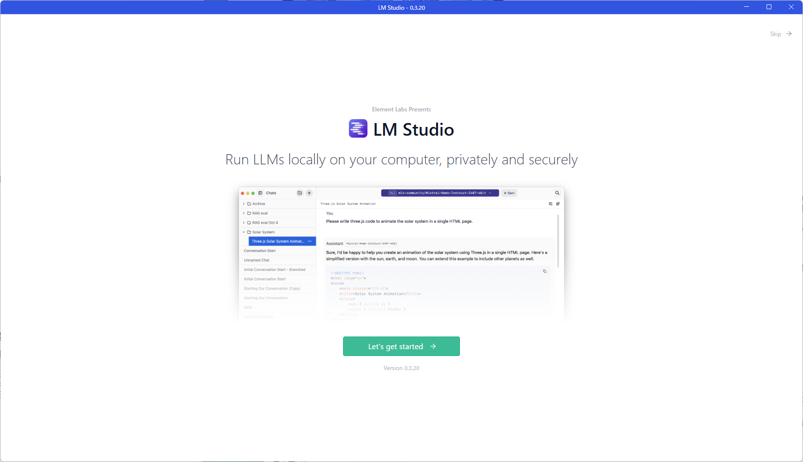 7. 自動的に LM Studio が起動する。"Let's get started" をクリックする。