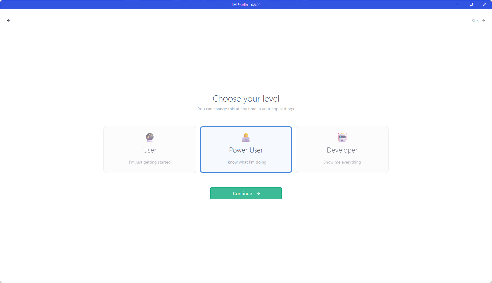 8. "Choose your level" では User, Power User, Developer 3種類選択できる。 あとで設定を変更できるとのことなので、ここではデフォルトの Power User を選択したまま "Continue" をクリックする。