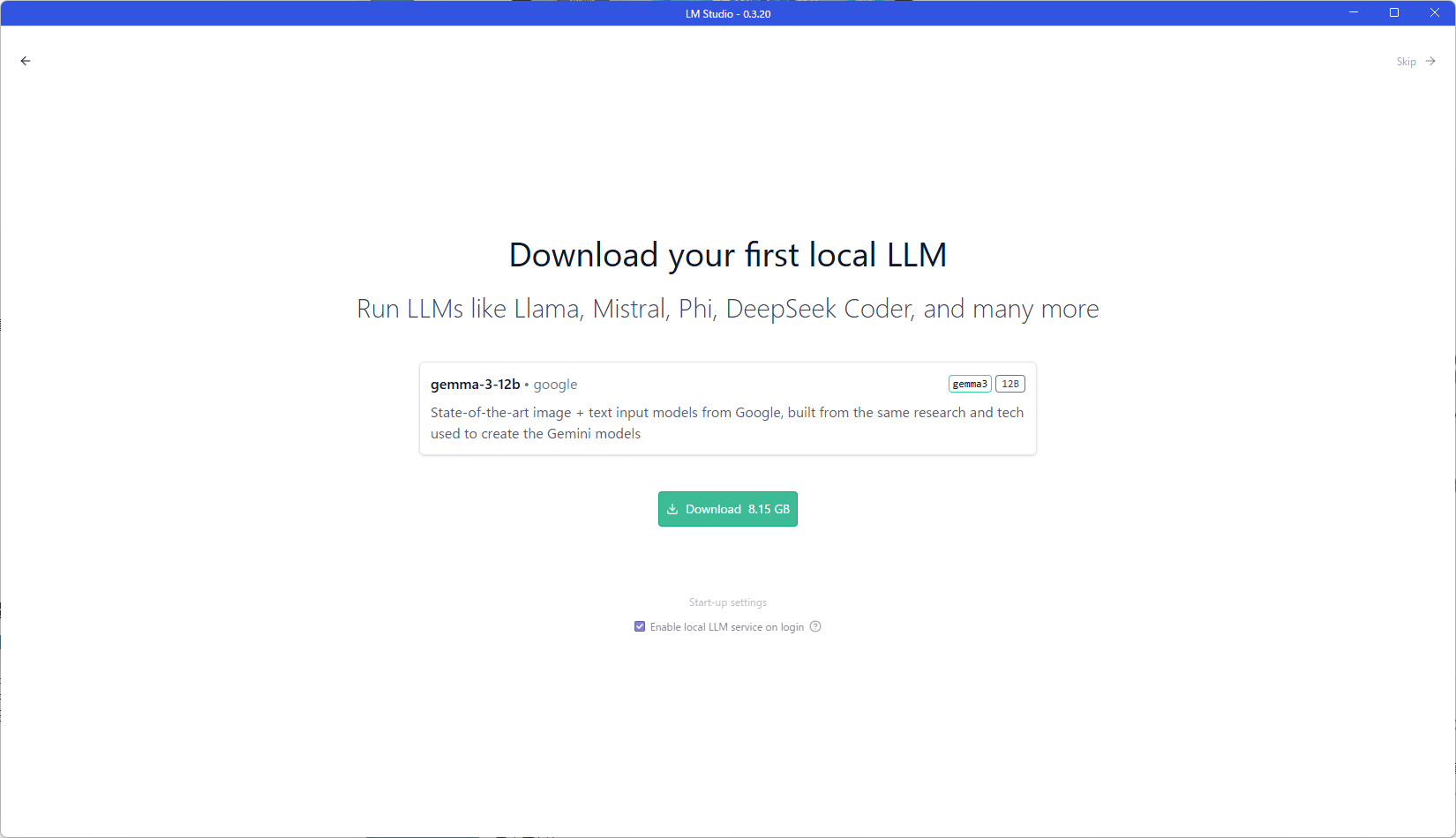 9. ダウンロードする LLM Model はデフォルトの gemma ままとして、"Download" をクリックする。