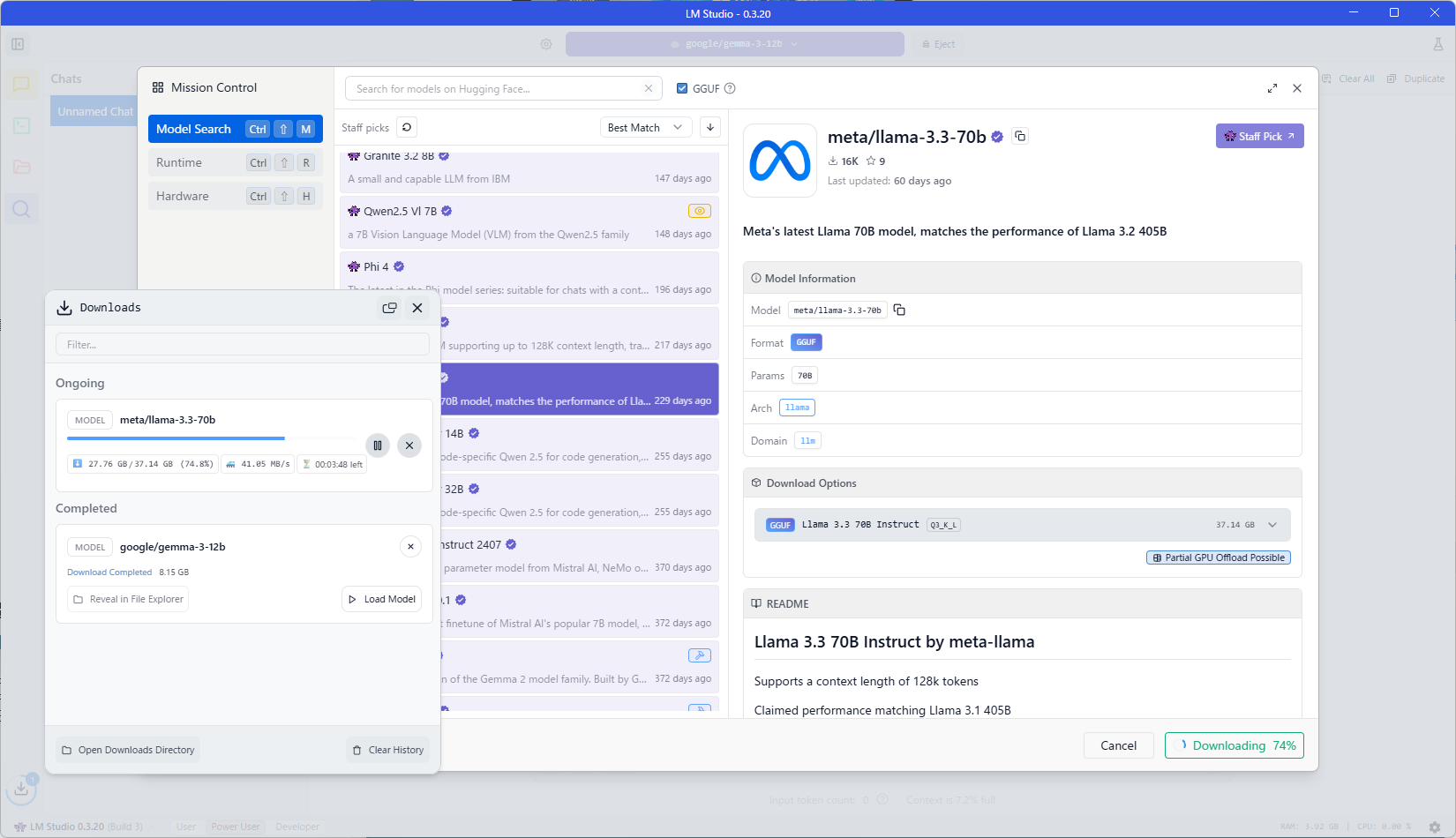 16. ウィンドウの左の「検索」アイコンを選択して、"Model Search" から LLama の最新版を選択してダウンロードする。 環境によるがダウンロード時間はかなりかかる。