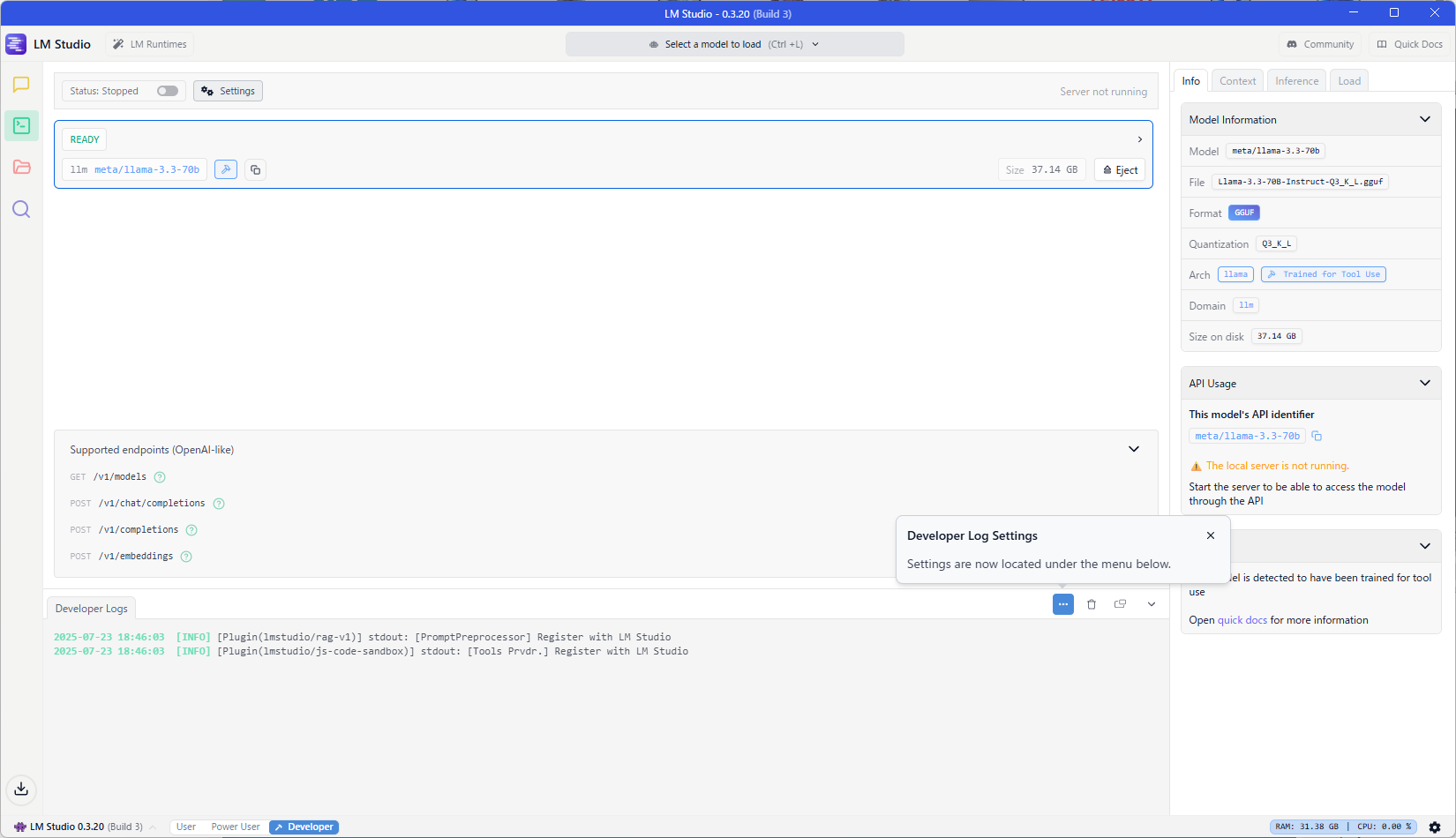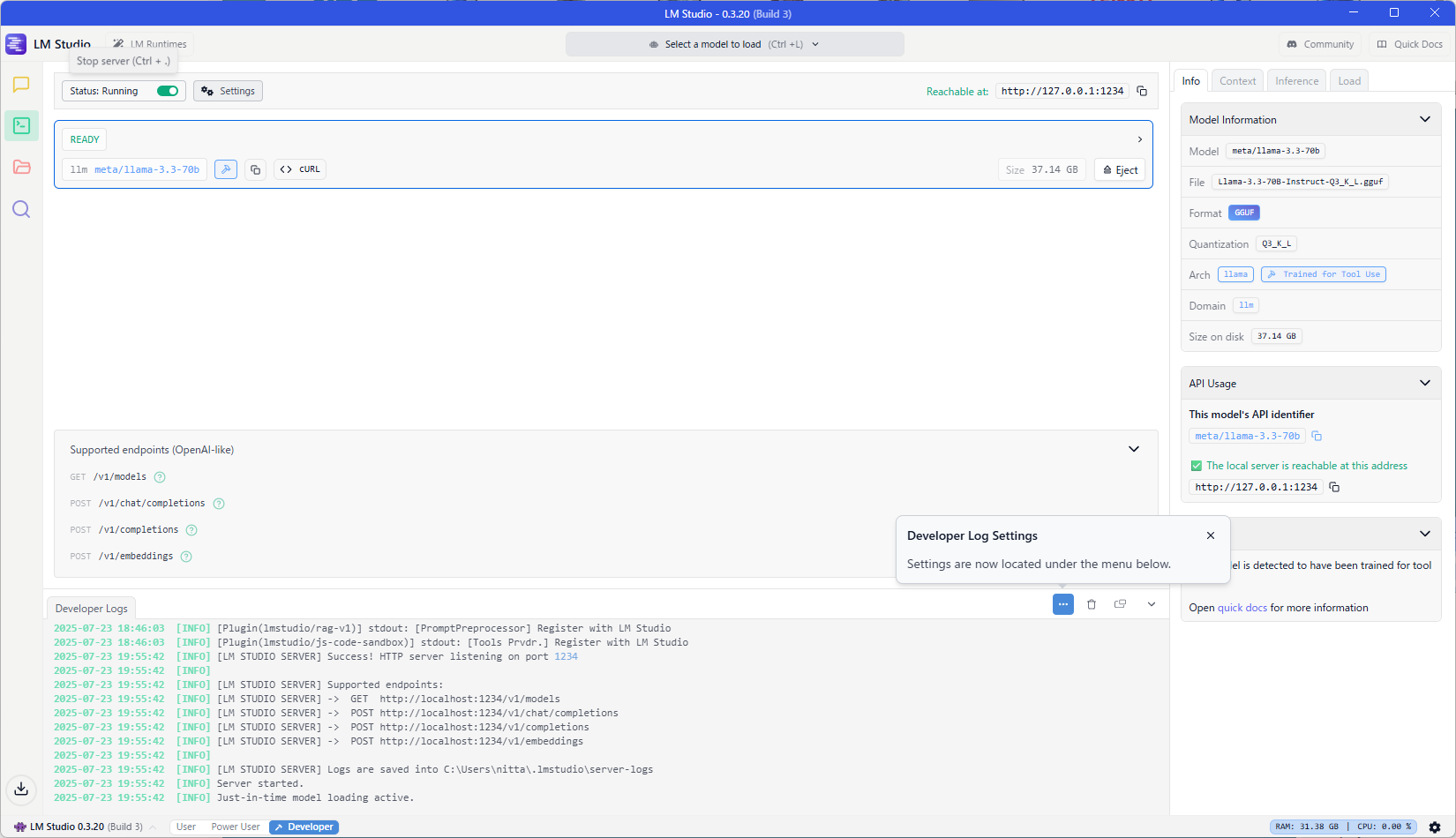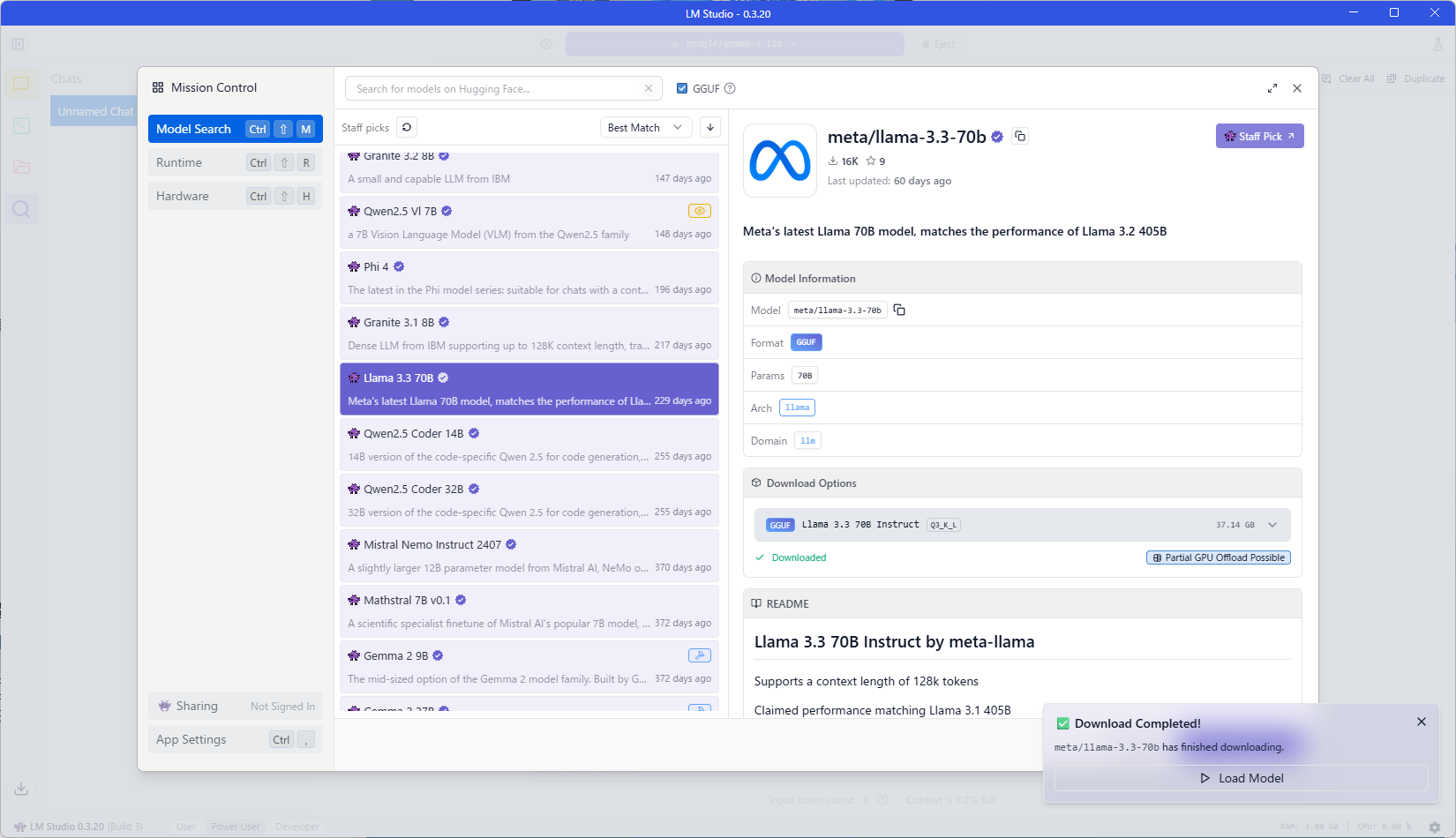 17. ダウンロードが終了すると "Load Model"を選択する。上のウィンドウが "meta/llama-33-70b" になっている。