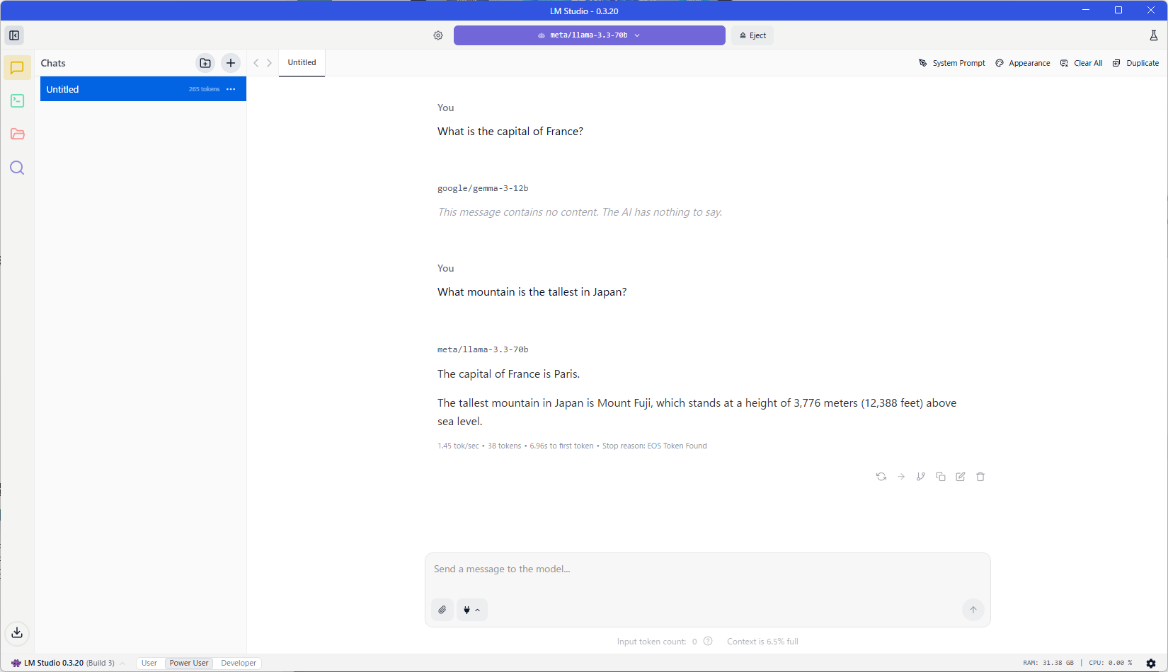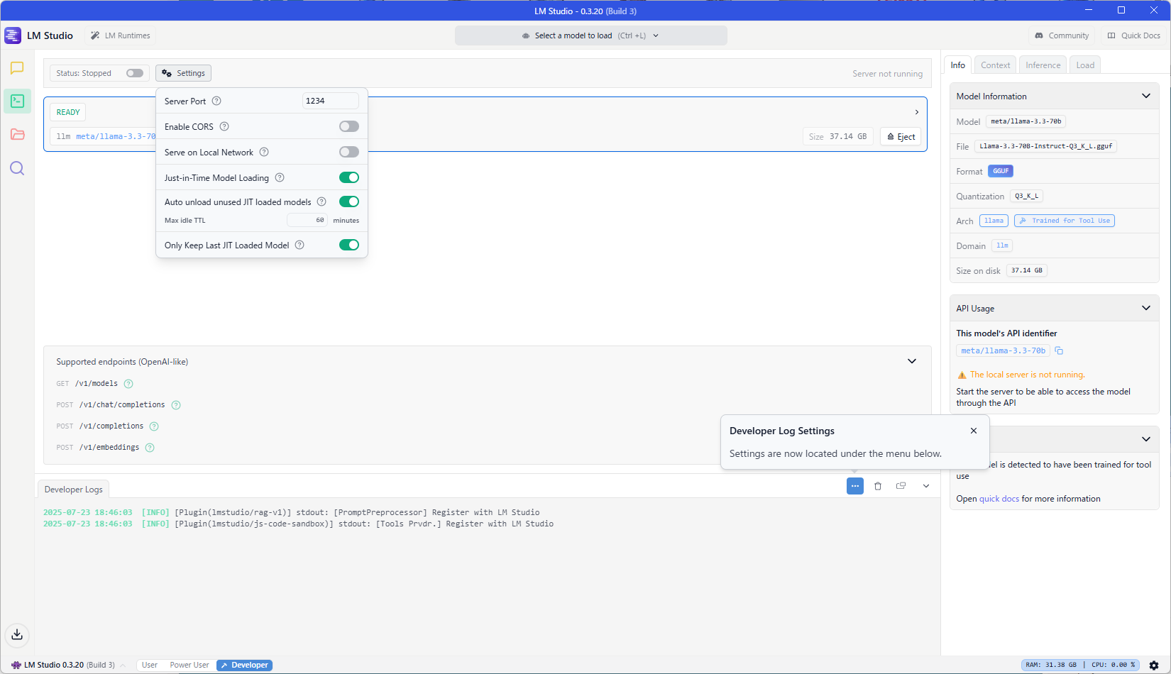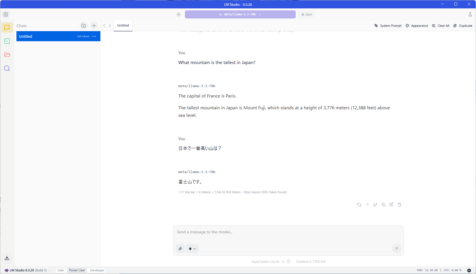 17. ダウンロードが終了すると "Load Model"を選択する。上のウィンドウが "meta/llama-33-70b" になっている。
