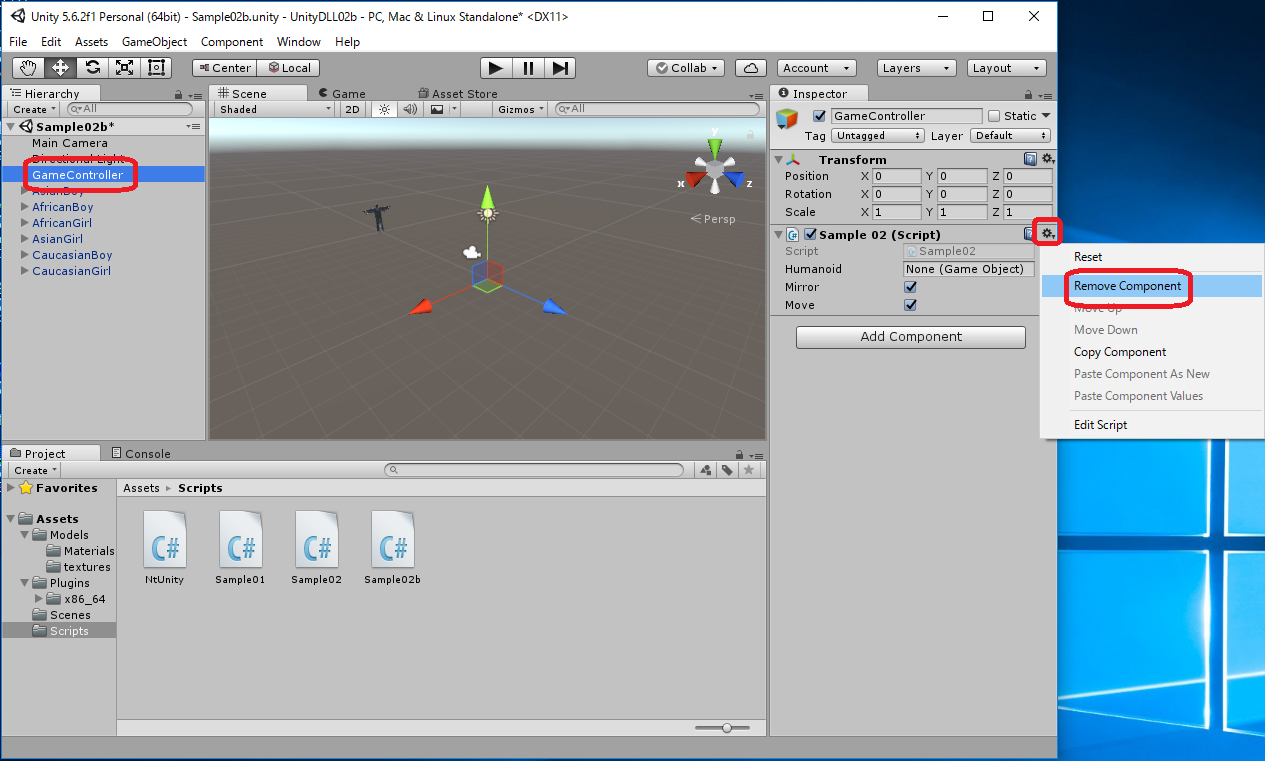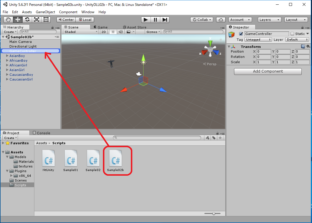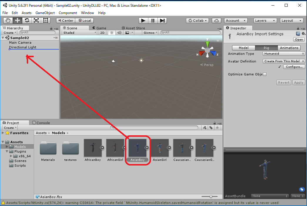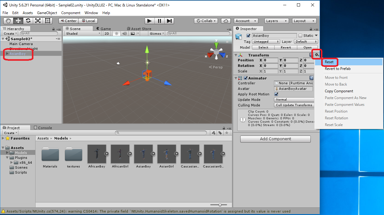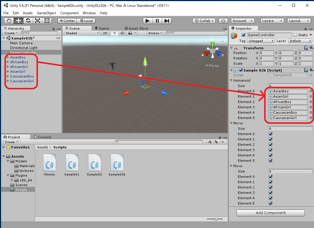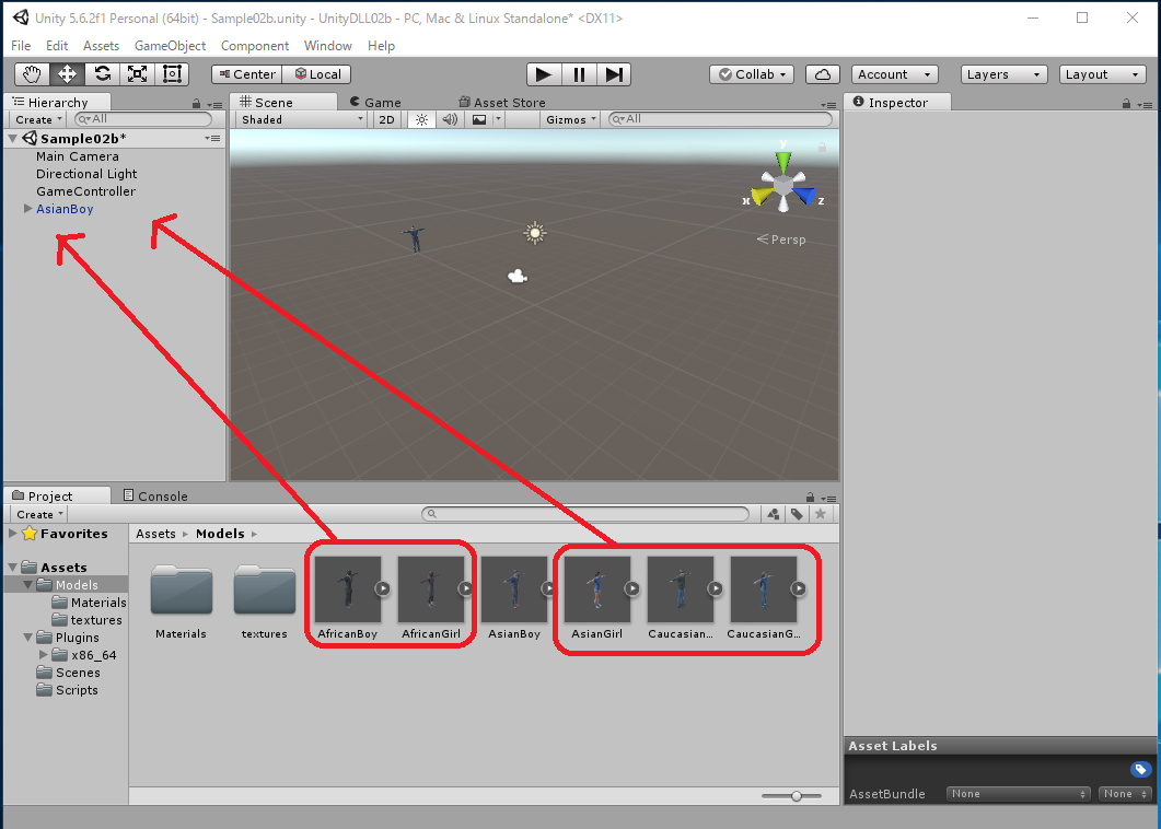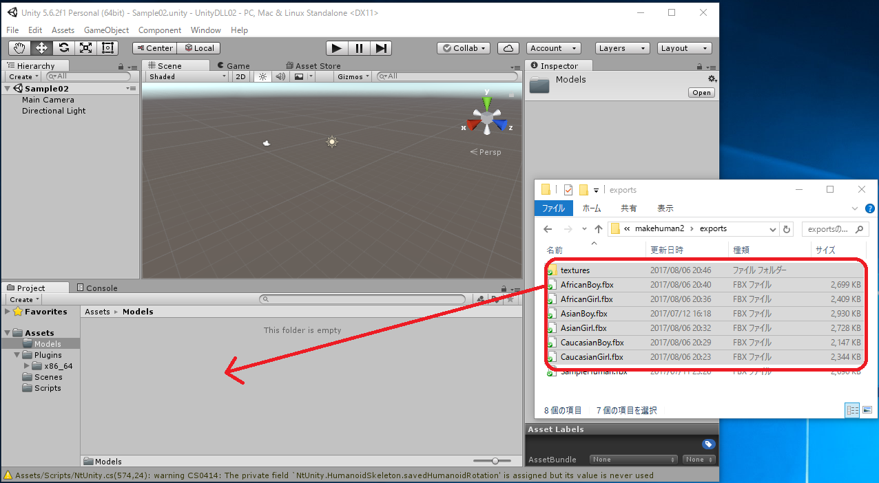 上記のzipファイルを展開すると、exports/の下に AsianBoy.fbx, AsianGirl.fbx, AfricanBoy.fbx, AfricanGirl.fbx, CaucasianBoy.fbx, CaucasianGirl.fbx と textures/ があるはずです。 これを Assets/Models/ の下にimportします。