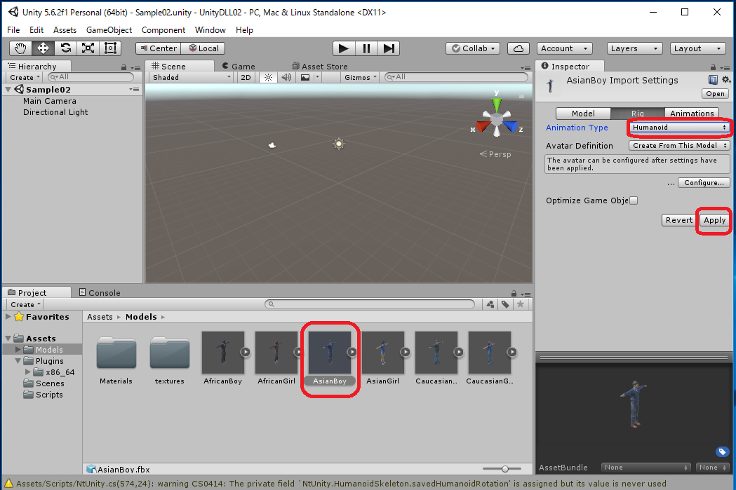 図では AsianBoy.fbx をHumanoid に変換する例を示しています。 6個のfbx全てについて Humanoid に変換する作業を行って下さい。