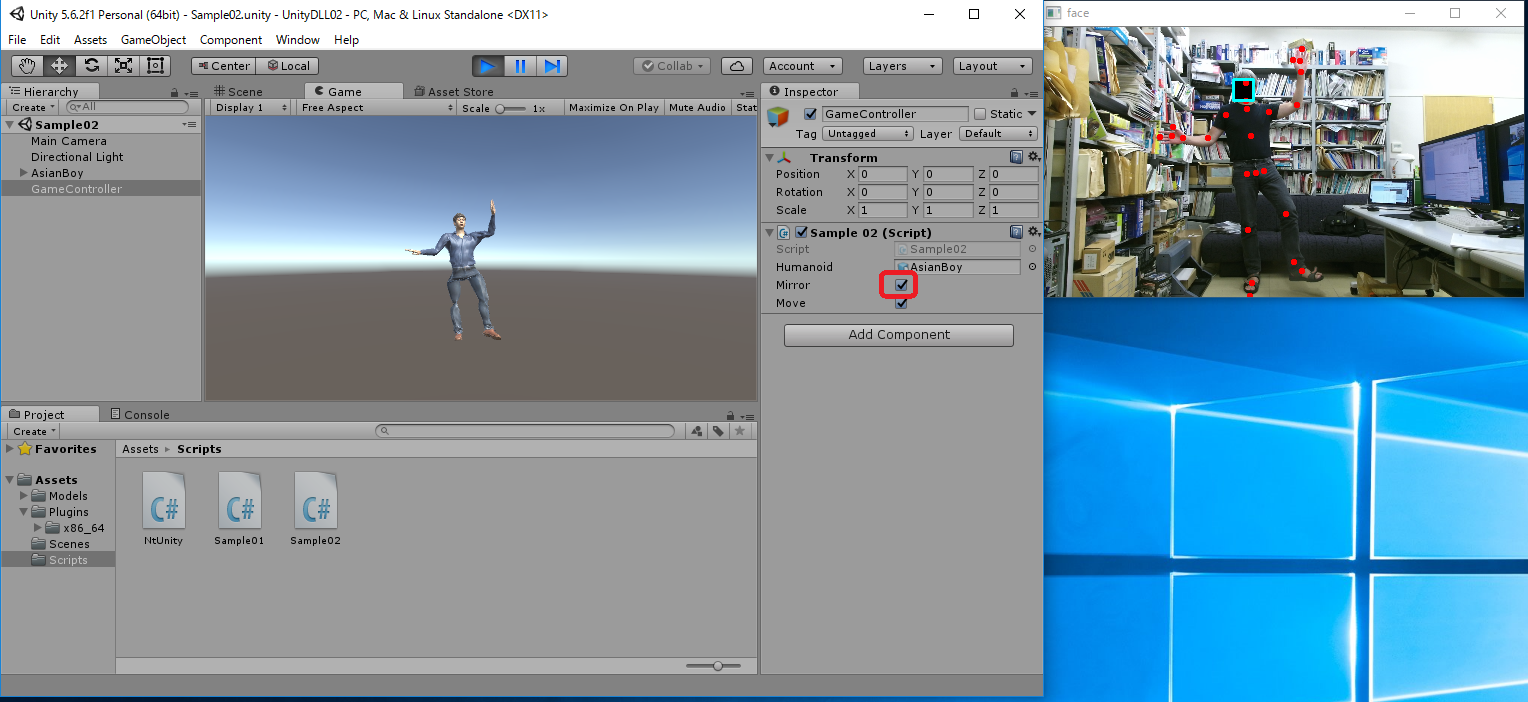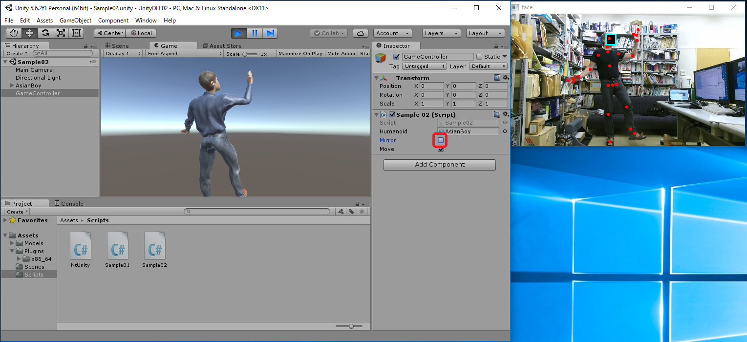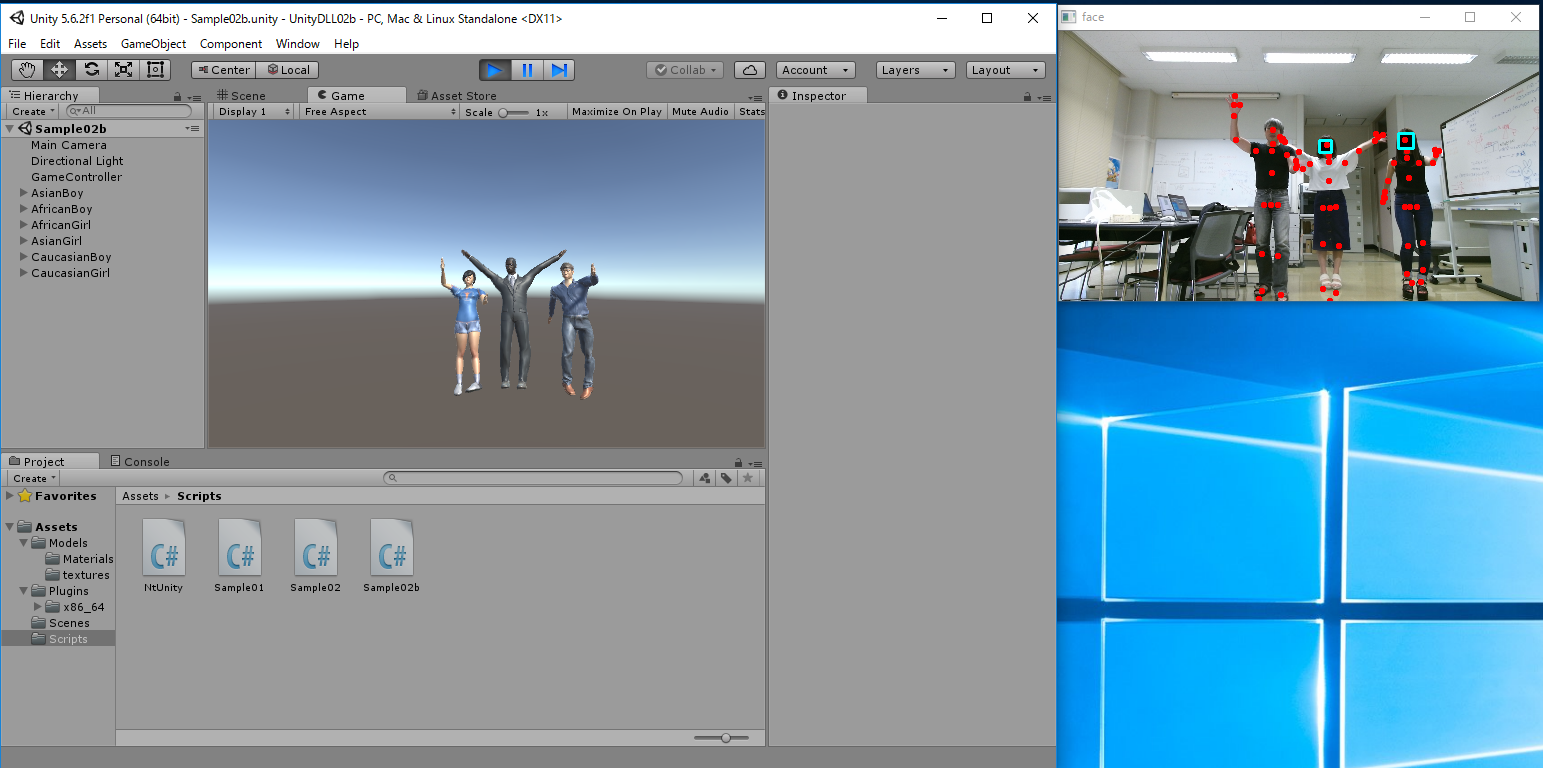 [注意] 骨格の認識状態を表示するためにDLL内でOpenCVのウィンドウを生成しています。 後から生成されたこのウィンドウにフォーカスがあるときは (= Unityのウィンドウにフォーカスがない場合は) Unityの画面は変化しないので注意して下さい。 Unityのウィンドウの上部をクリックしてUnityのウィンドウにフォーカスが ある状態で動作を試して下さい。
