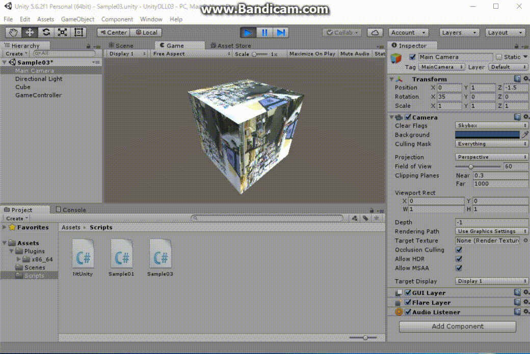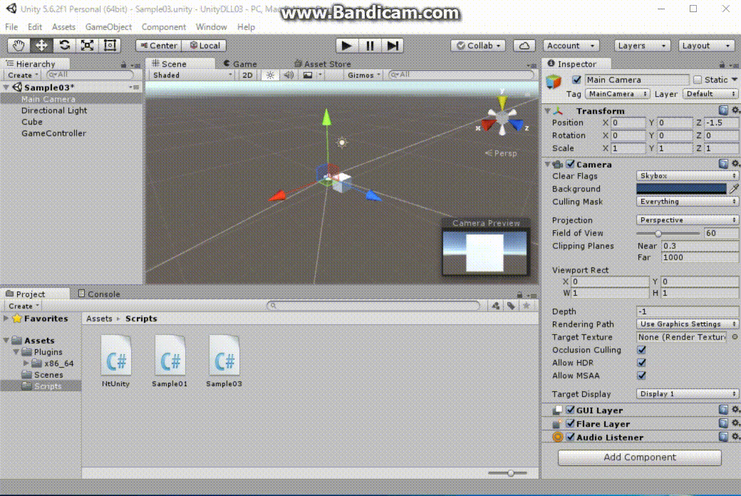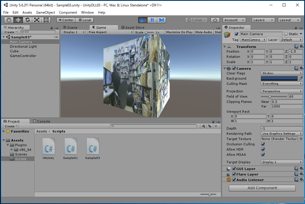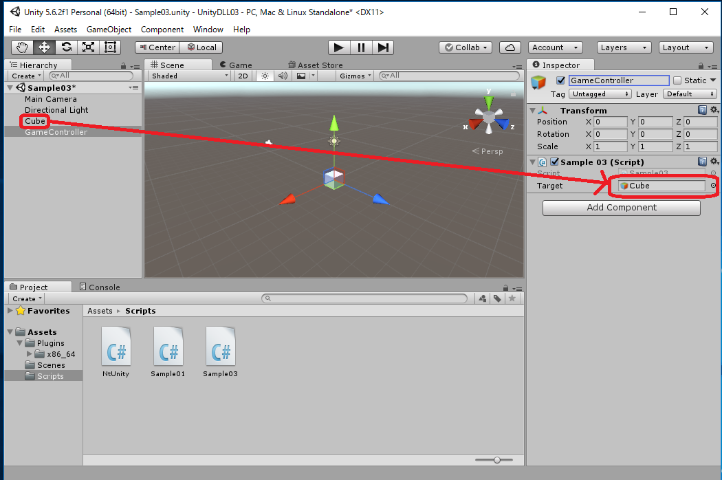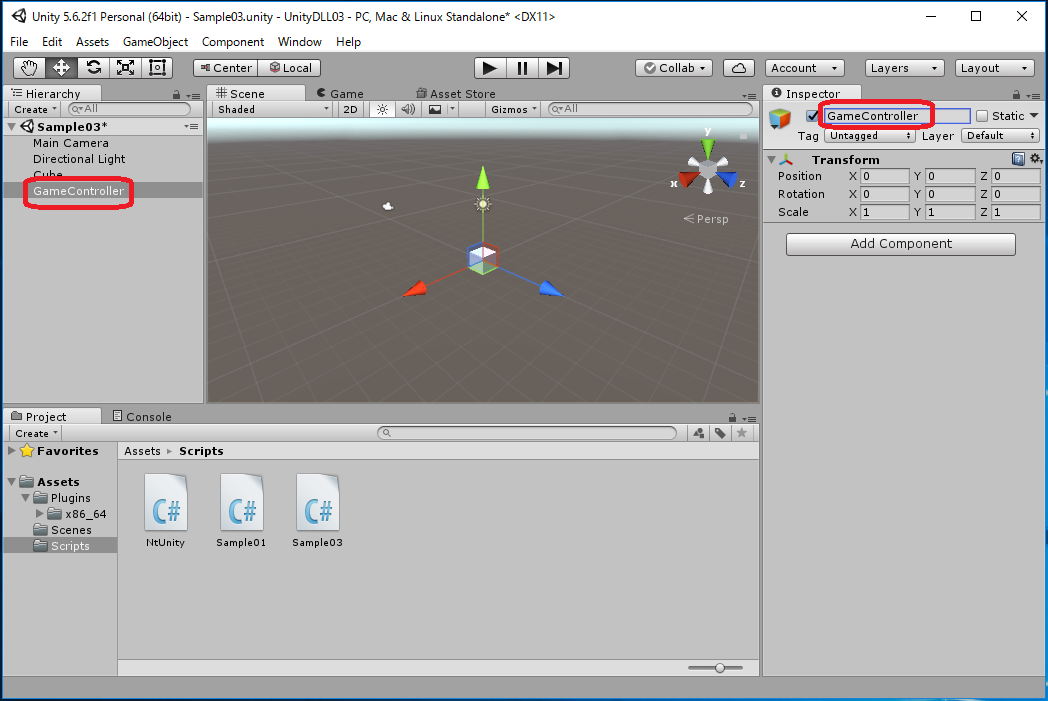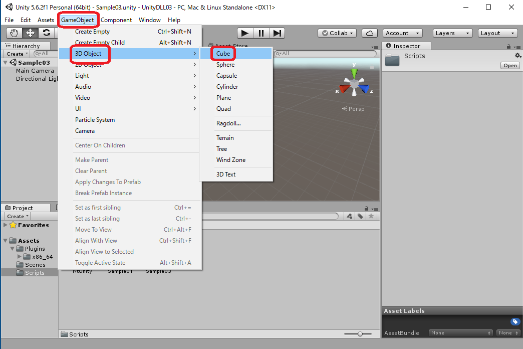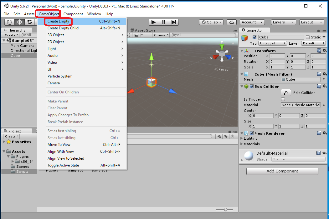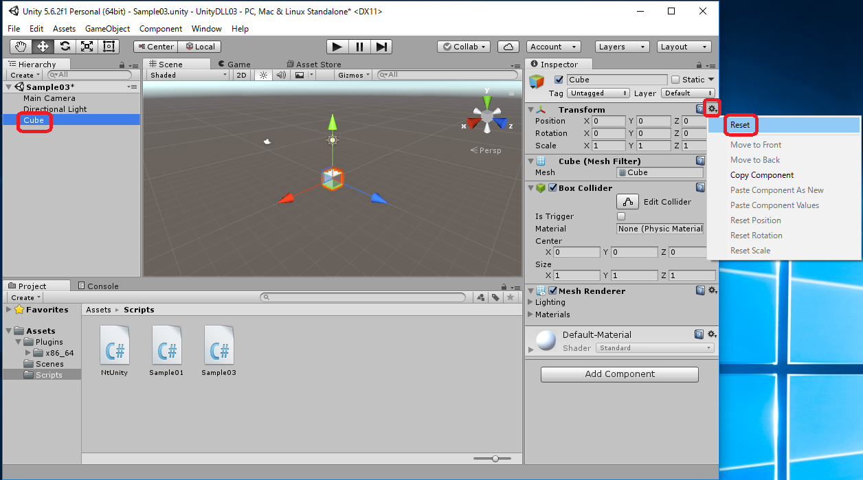 上部のメニューから「Assets」-> 「Create」 -> 「C# Script」 -> ファイル名は Sample03