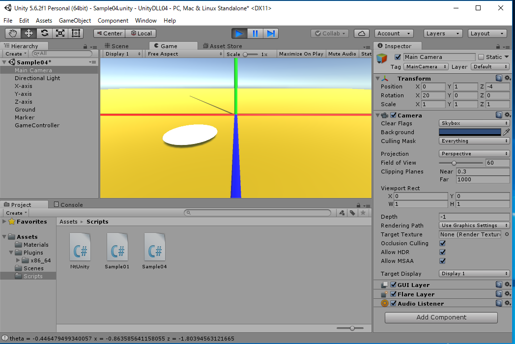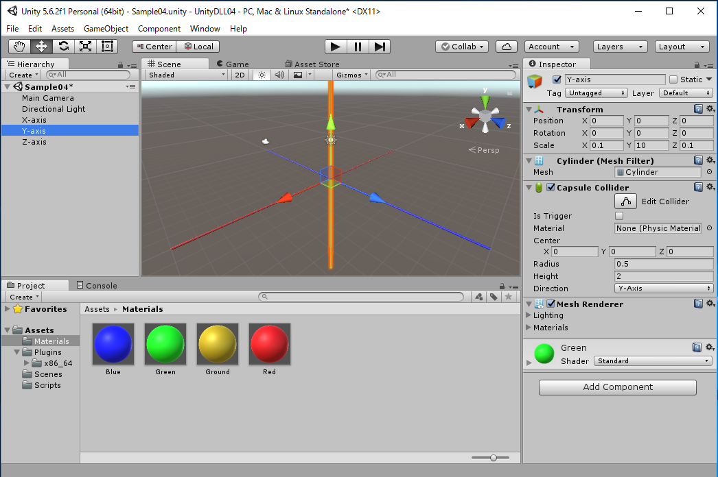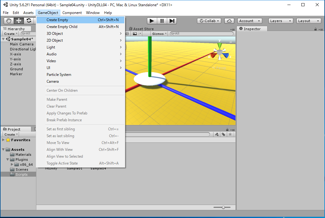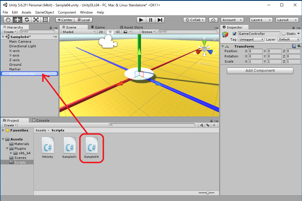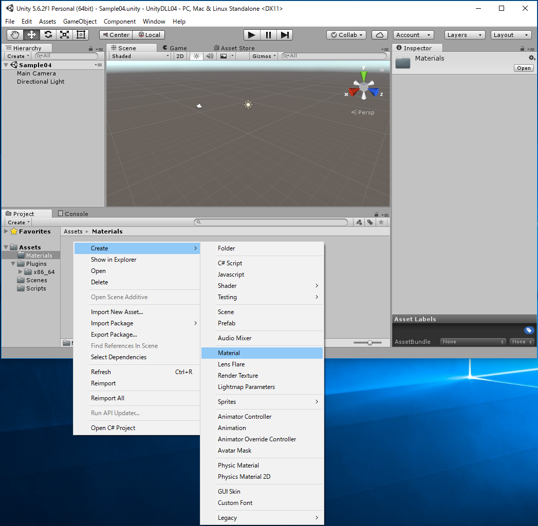 上部のメニューから「Assets」-> 「Create」 -> 「C# Script」 -> ファイル名は Sample04