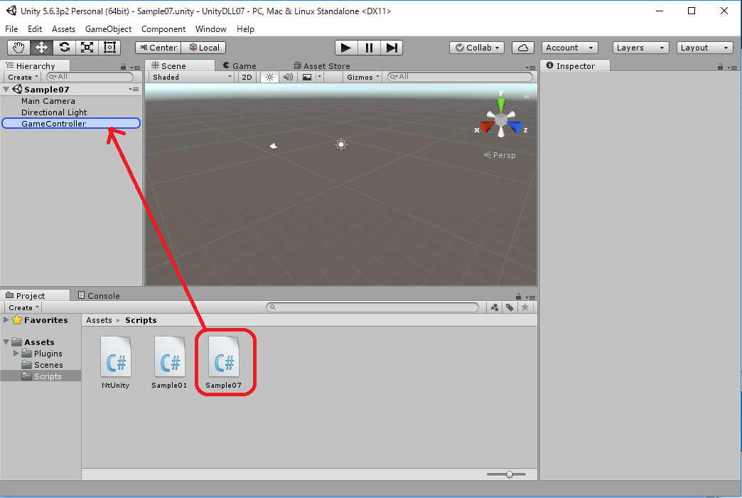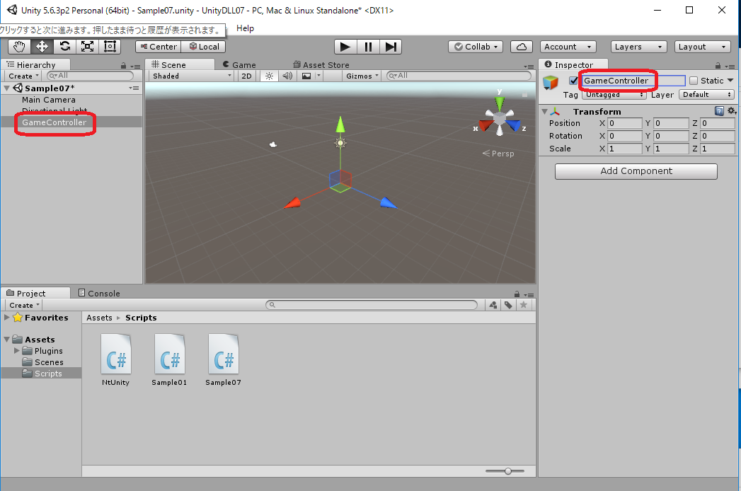 10. ProjectウィンドウのAssets/Scripts/Sample07.cs をHierarchyの GameController のComponentとして付加します。