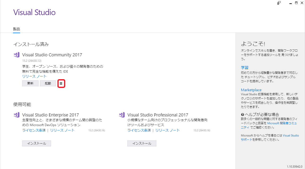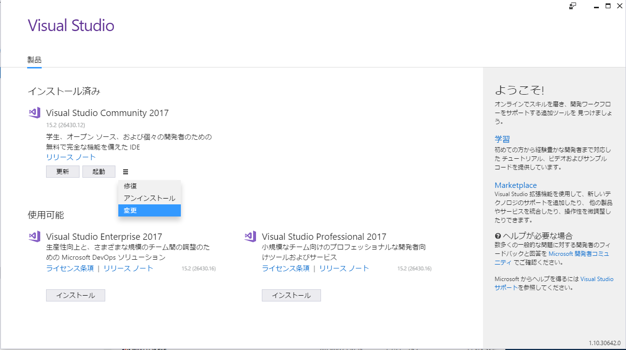2. これは VisualStudio2017 Community のInstaller の画面です。 「更新 起動」の右にある をクリックすると メニューが表示されるので、「変更」を選択して下さい。