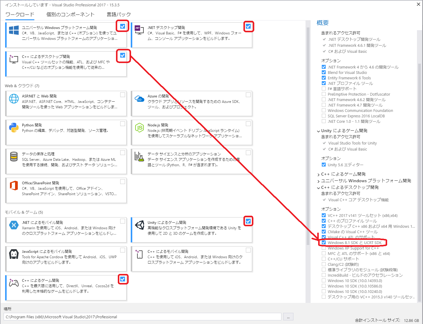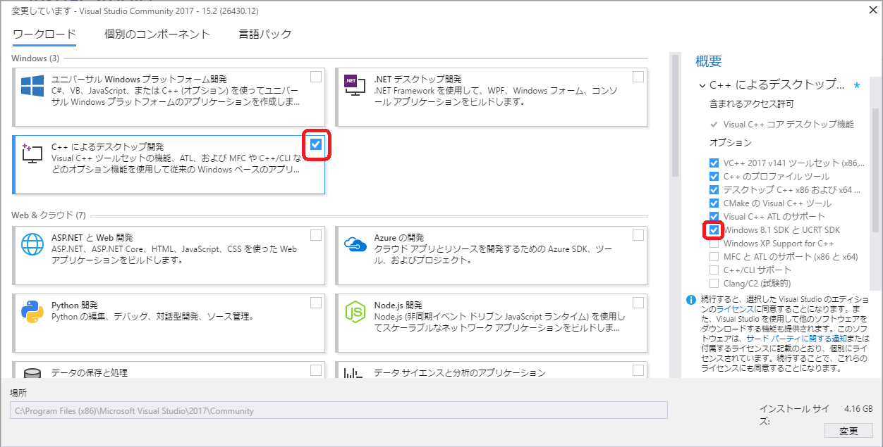 3. 「C++ によるデスクトップ開発」を選択すると、ウィンドウの右側に「オプション」が表示されます。 もしも「Windows 8.1 SDK と UCRT SDK」の項目がチェックされていない場合は、 チェックしてインストールをして下さい。
