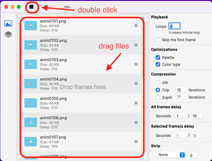 複数の画像ファイルをドラッグしてから、左上の ■ (黒四角) をダブルクリックすると apngb-animated.png ができる。