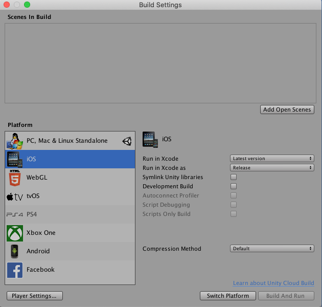 - Unityのメニューで File → Build Settigs... → Platform で iOS を選択 → Player Settings...