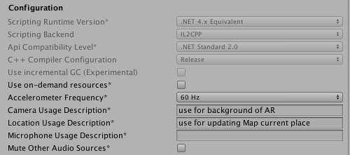 - Inspector ウィンドウで、Other Settings の Configuration の中の