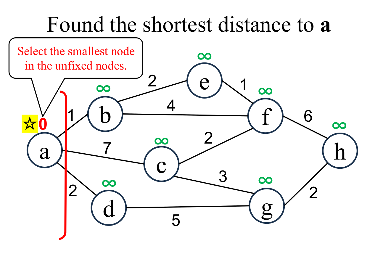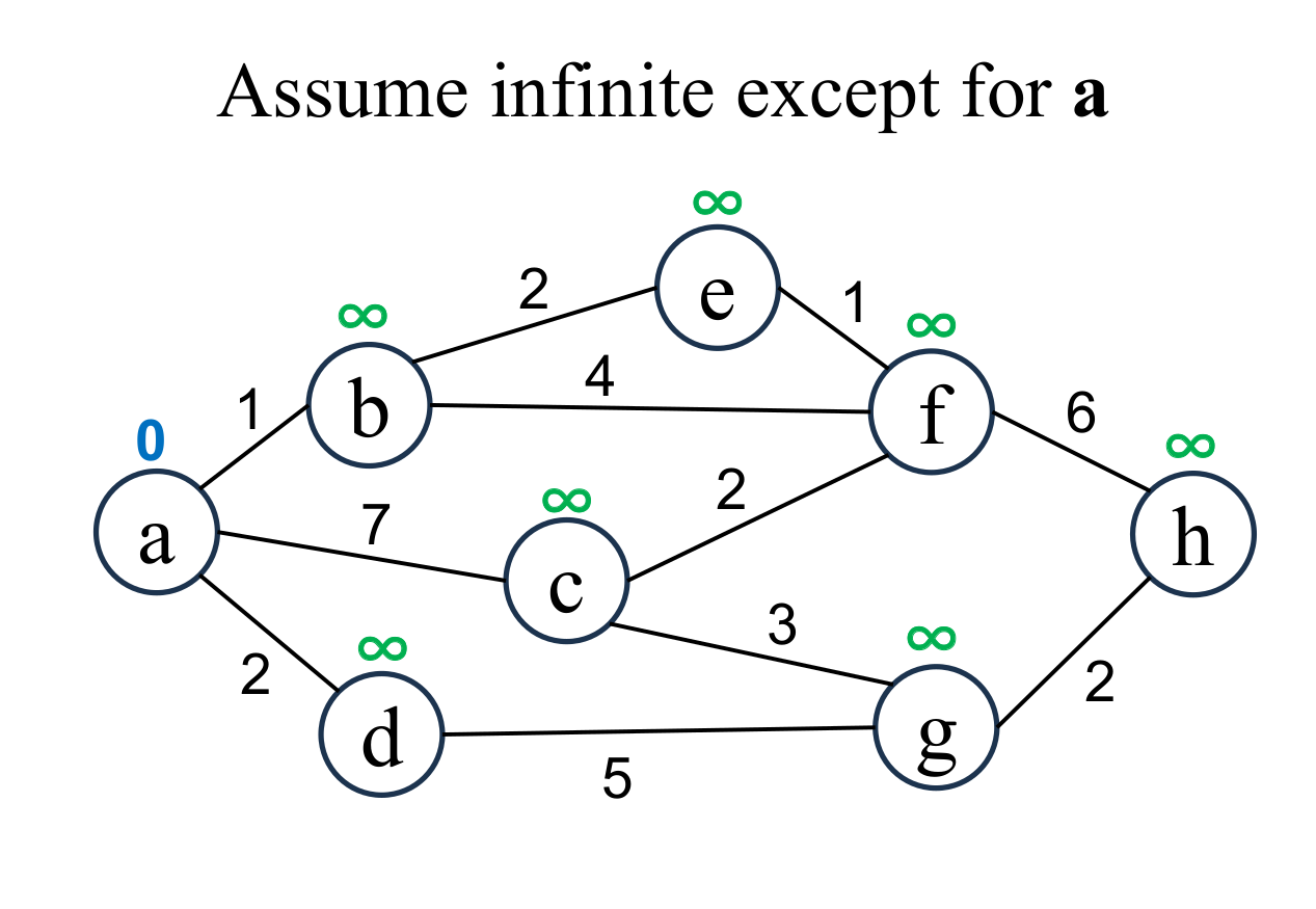 and its value is infinity ($\infty$). Then, assume the shortest distance of the starting node (a) is 0. |