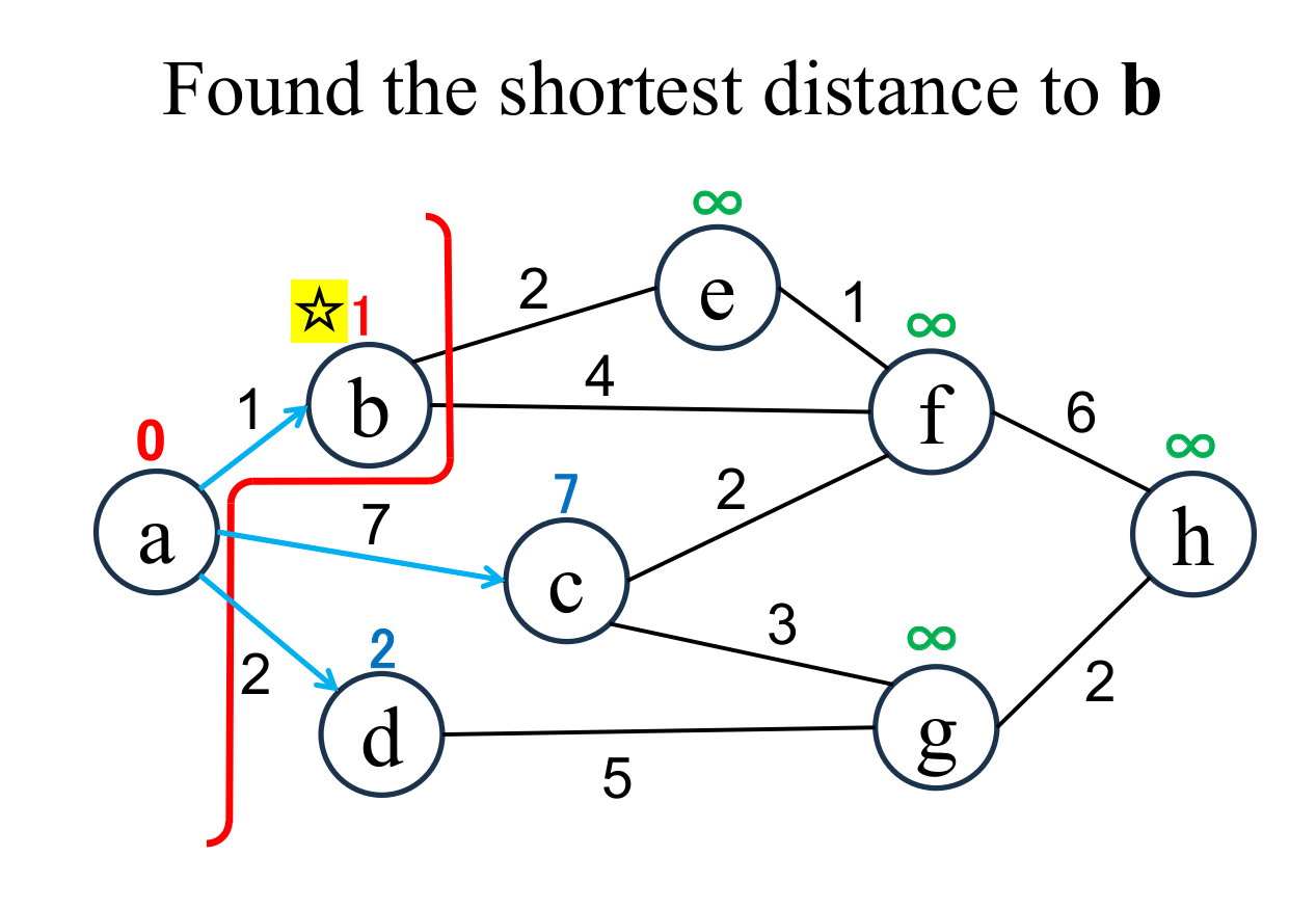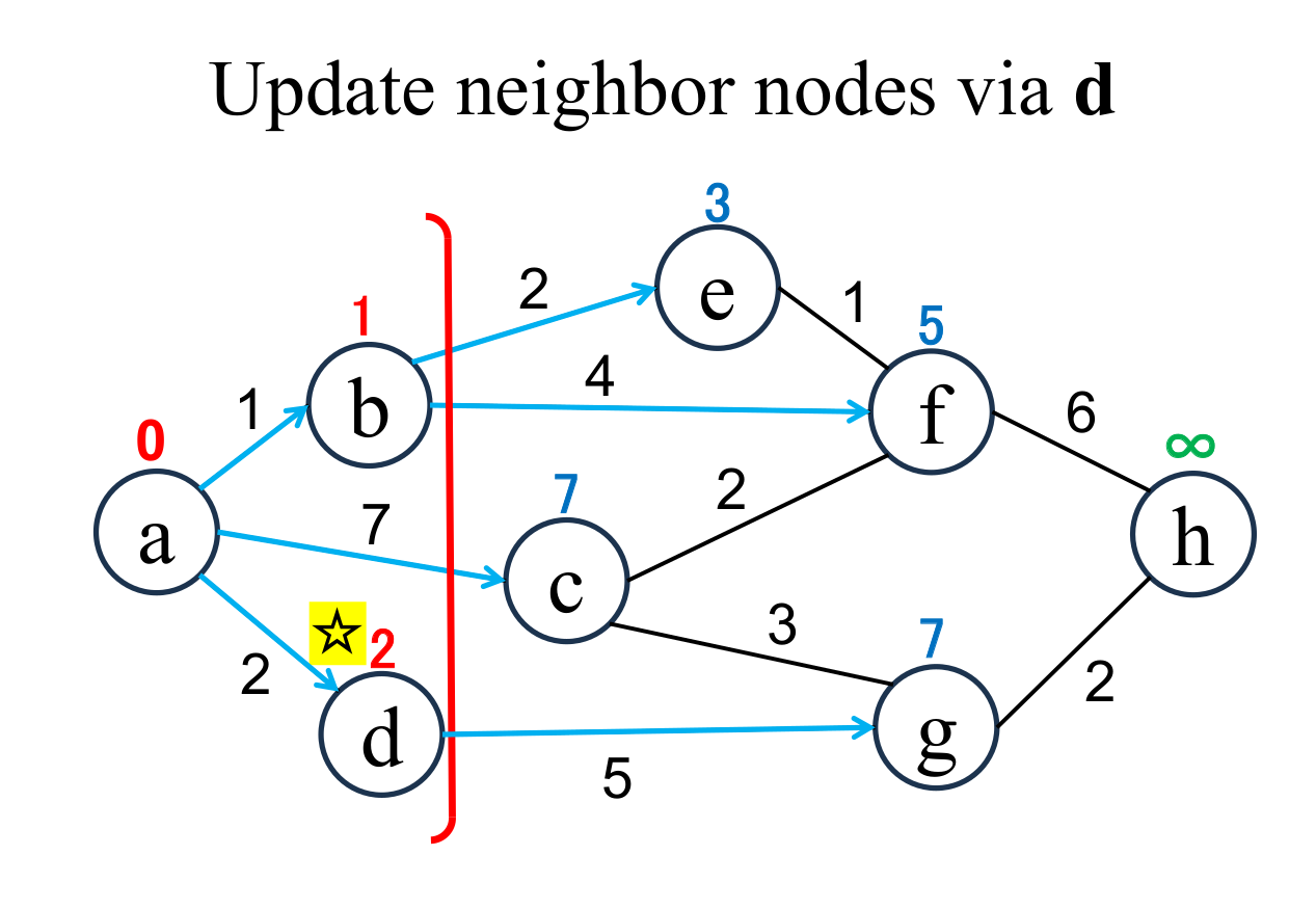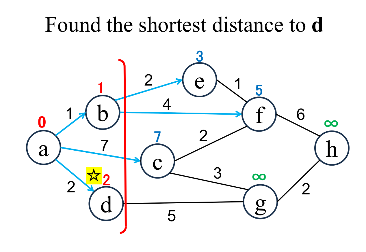 among the "unfixed" nodes. The shortest distance of the selected node (d marked with ☆) is "fixed" to the current value (2). |