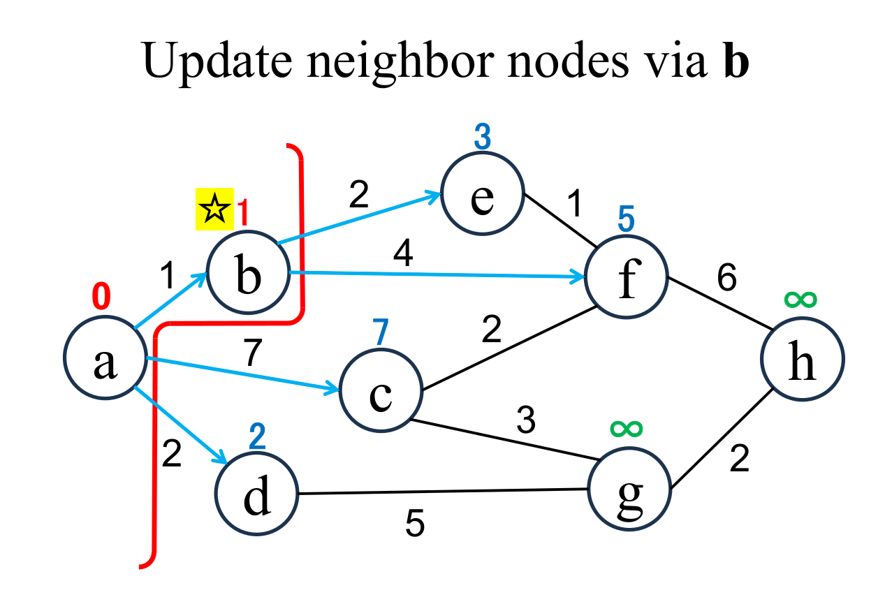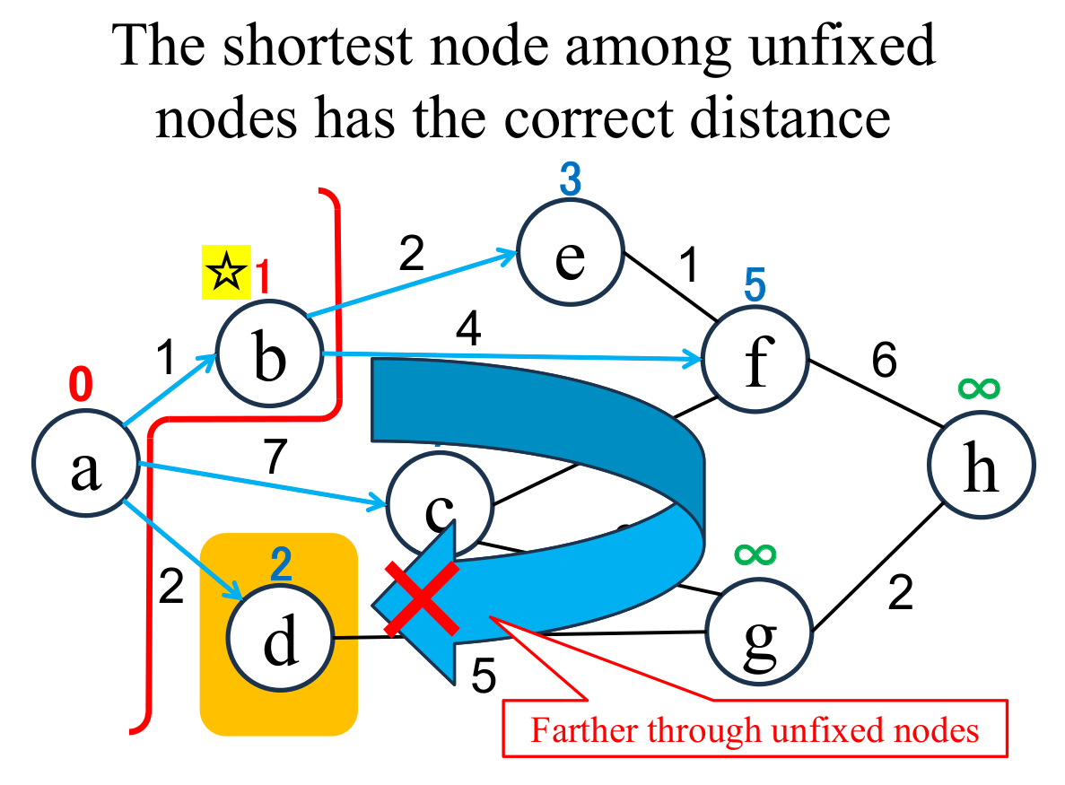 among the "unfixed" nodes. The shortest distance of the selected node (b marked with ☆) is "fixed" to the current value (1). If there are multiple nodes with the shortest distance value, it doesn't matter which one you choose. |