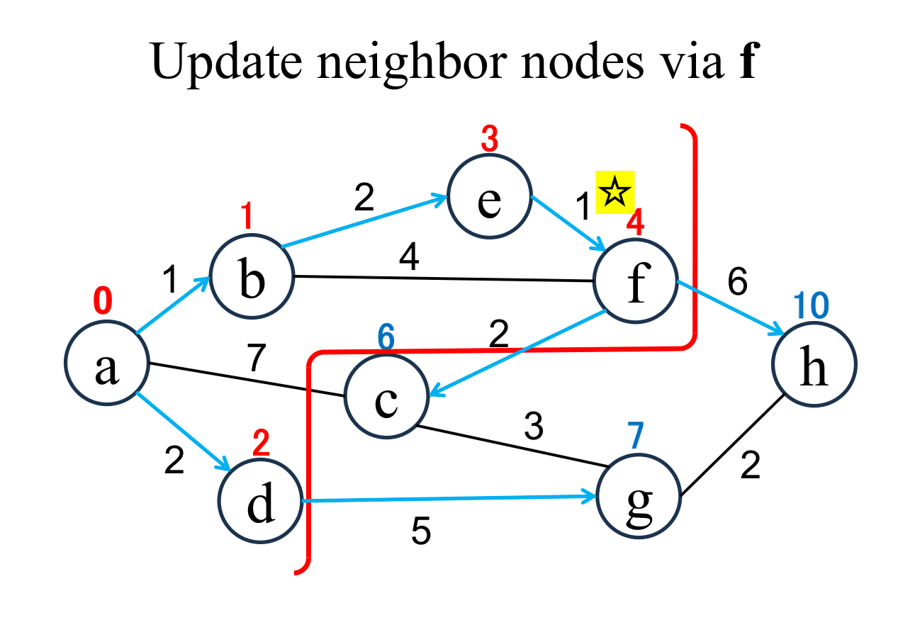 Calculate the distance of each node (c, h), if and only if the node is "directly connected" from the most recently fixed node (f with ☆), and its "shortest distance" is "unfixed". If the result is less than current value, update it (c → 6, h → 10). |