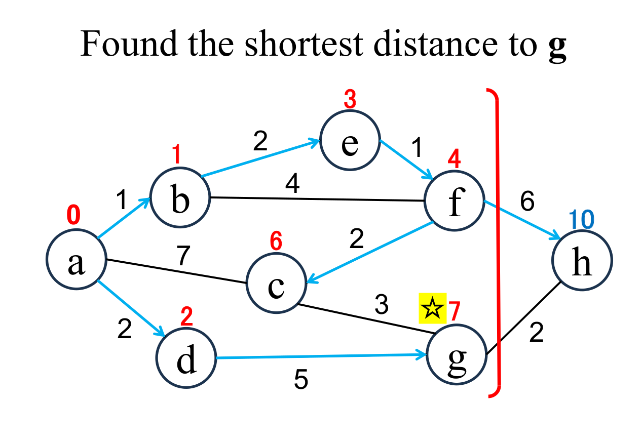 among the "unfixed" nodes. The shortest distance of the selected node (g marked with ☆) is "fixed" to the current value (7). |