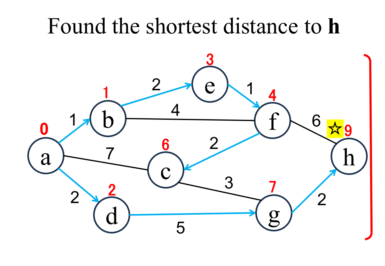 among the "unfixed" nodes. The shortest distance of the selected node (h marked with ☆) is "fixed" to the current value (9). |