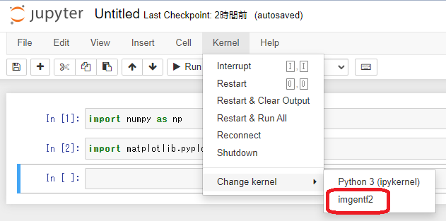 "Kernel" → "Change kernel" → imgentf2