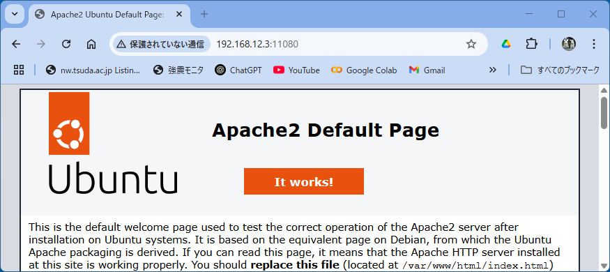 $ ssh -p 11022 www@192.168.12.3 ← ホストOSのIPアドレスと、ポートフォワーディングされるポート番号 www@192.168.12.3's password:Welcome to Ubuntu 24.04.2 LTS (GNU/Linux 6.11.0-25-generic x86_64) ← Container の www 権限の対話環境が始まる * Documentation: https://help.ubuntu.com * Management: https://landscape.canonical.com * Support: https://ubuntu.com/pro This system has been minimized by removing packages and content that are not required on a system that users do not log into. To restore this content, you can run the 'unminimize' command. Last login: Mon May 12 12:28:50 2025 from 172.17.0.1 To run a command as administrator (user "root"), use "sudo". See "man sudo_root" for details. $ whoami www $ pwd /home/www $ ls -a . .. .bash_history .bash_logout .bashrc .cache .profile $ exit ← Container の www 権限の対話環境を終了する logout Connection to 192.168.12.3 closed. $ ← 他の PC の対話環境に戻る- [WWW] 他のPC からブラウザを用いて、「ホストOSのIPアドレス」とポートフォワーディングされるポート番号を指定して WWW アクセスする。