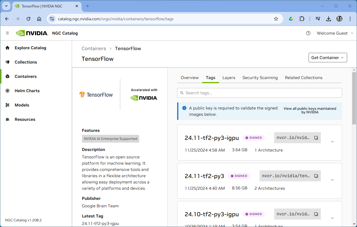 を選択し、"NVIDIA Platform" で TensorFlow にチェックをつけて、tags タグを選択する。