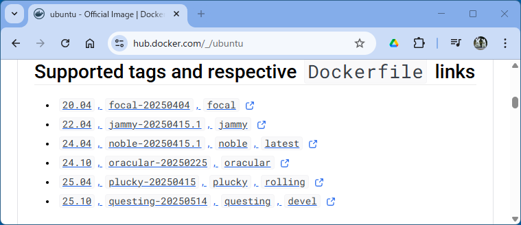 $ docker container ls> CONTAINER ID IMAGE COMMAND CREATED STATUS PORTS NAMES 75496fff6f39 ubuntu:24.04 "/bin/bash" 3 hours ago Up 10 minutes ubuntu24a